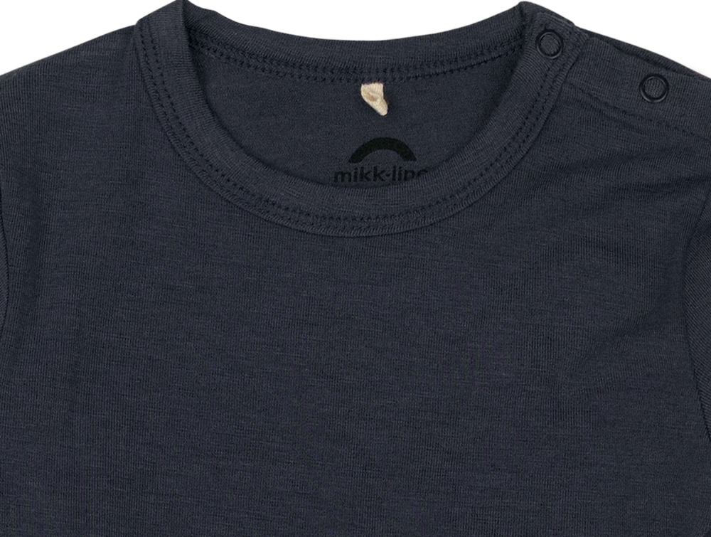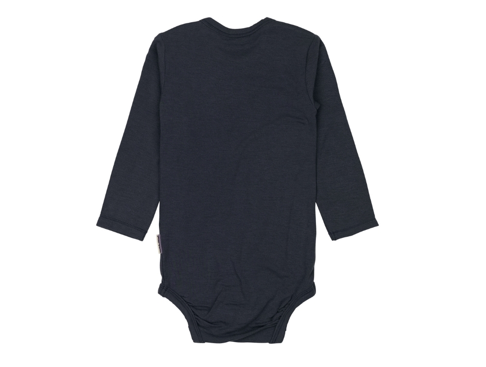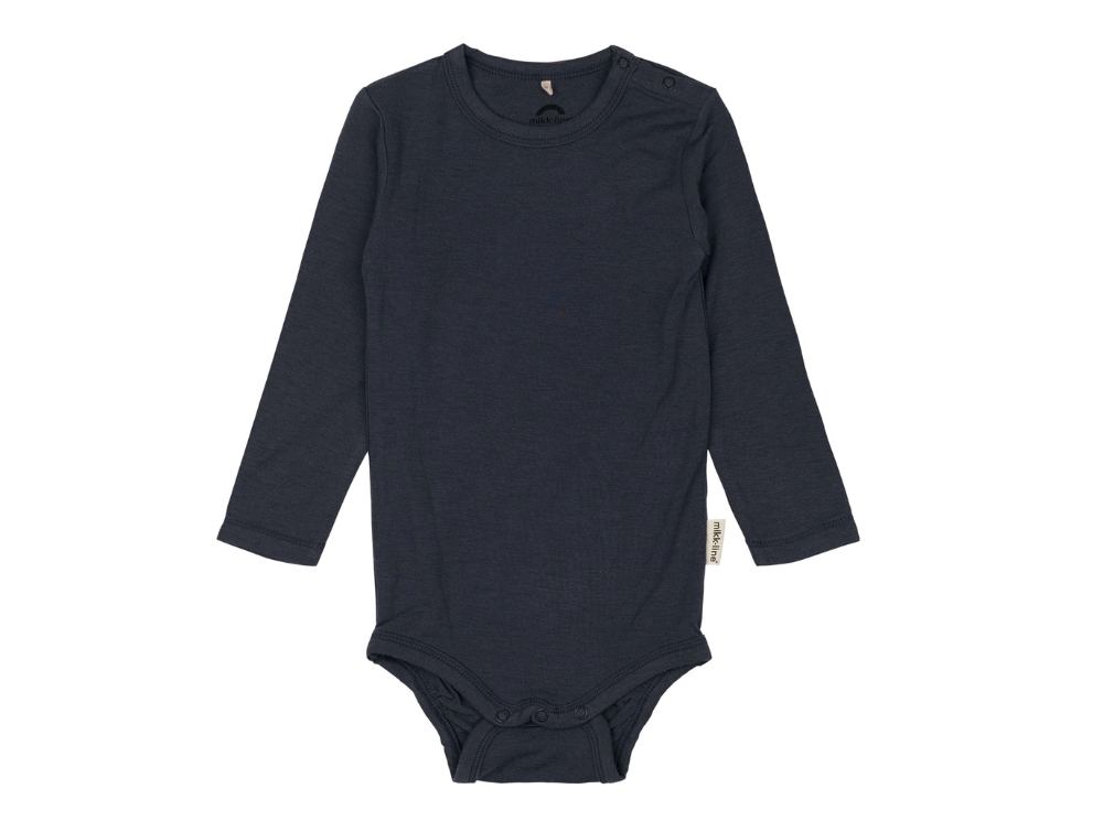 Body i blå nuance fra Mikk-Line i en blød merinould/bambus kvalitet. Modellen har lange ærmer, rund hals og praktiske trykknapper på skulderen og mellem benene.