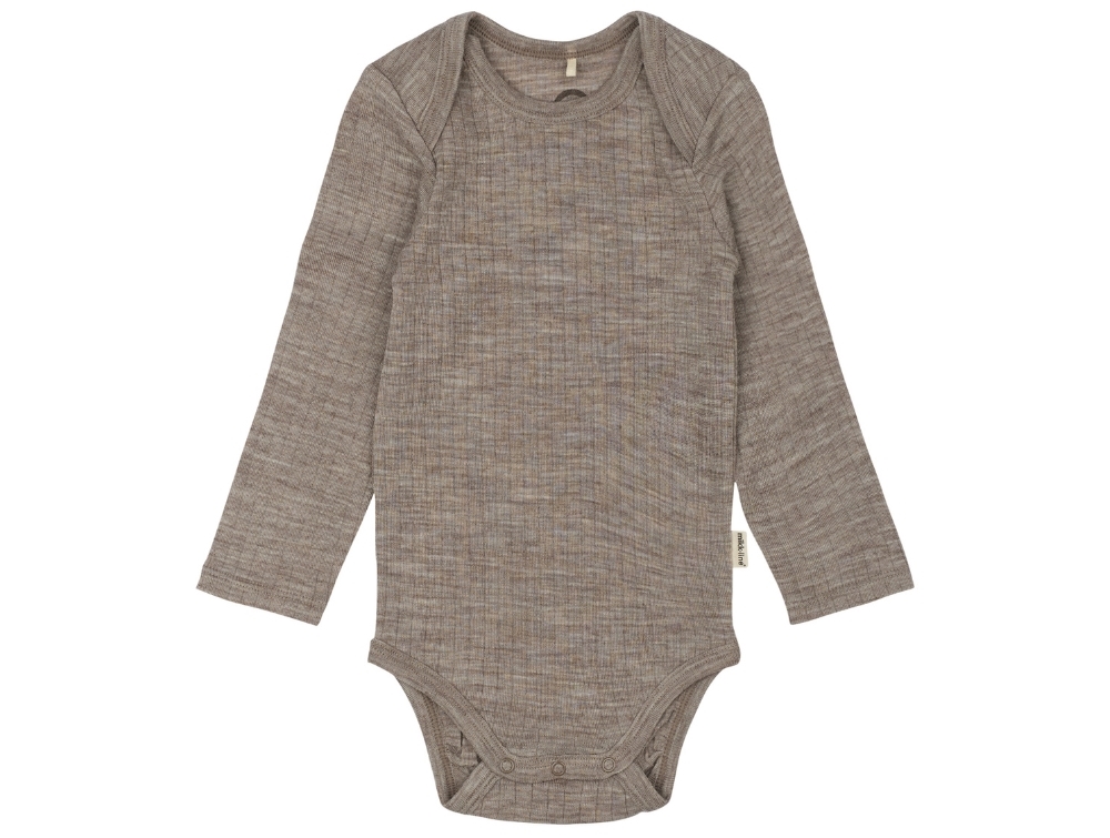 Body i brun meleret nuance fra Mikk-Line i 100% merinould. Modellen har lange ærmer, kuvertlukning i halsen og trykknapper mellem benene.