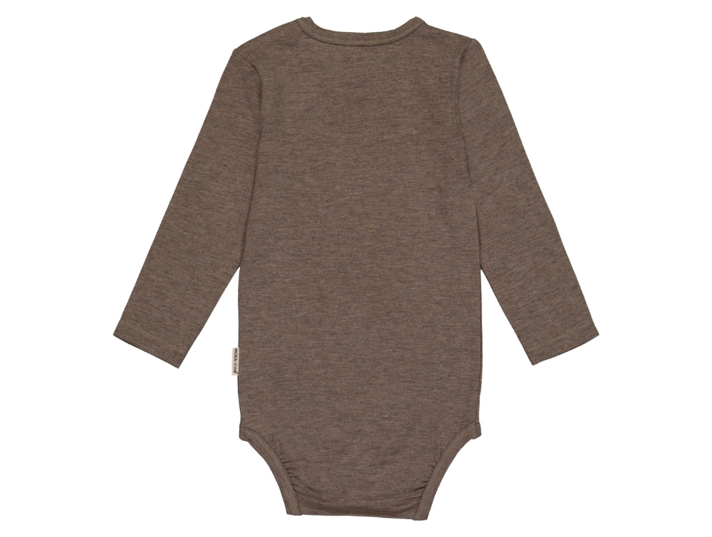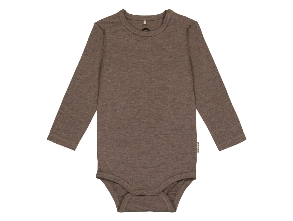Body i brun meleret nuance fra Mikk-Line i en blød merinould/bambus kvalitet. Modellen har lange ærmer, rund hals og praktiske trykknapper på skulderen og mellem benene.
