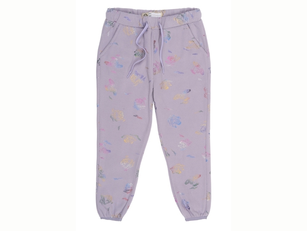 Sættet består af lilla fleecejakke og bukser med glitrende svaneprint i regnbuefarver. Et blødt og praktisk sæt, der kan bruges både sammen og hver for sig – som varm mellemlag under regntøj eller flyverdragt, eller som let overtøj på tørre dage.