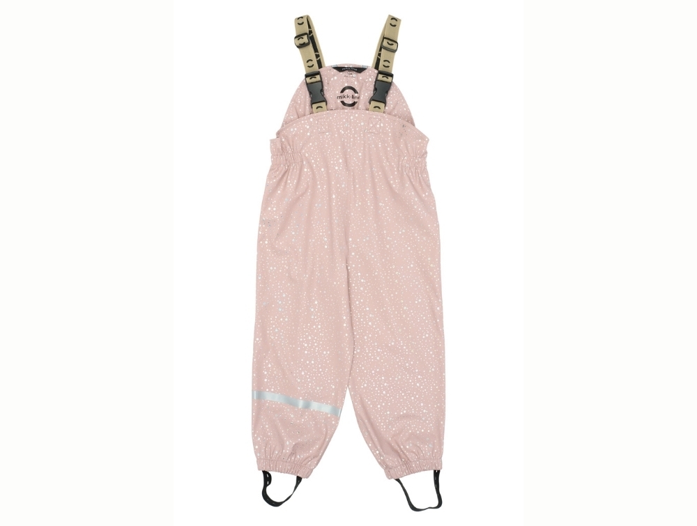 Bukserne har justerbare seler med klikspænder, elastik ved anklerne og justerbare fodstropper, der holder bukserne på plads. Det glitrende design giver et fint og legende udtryk til regnvejrsdage.