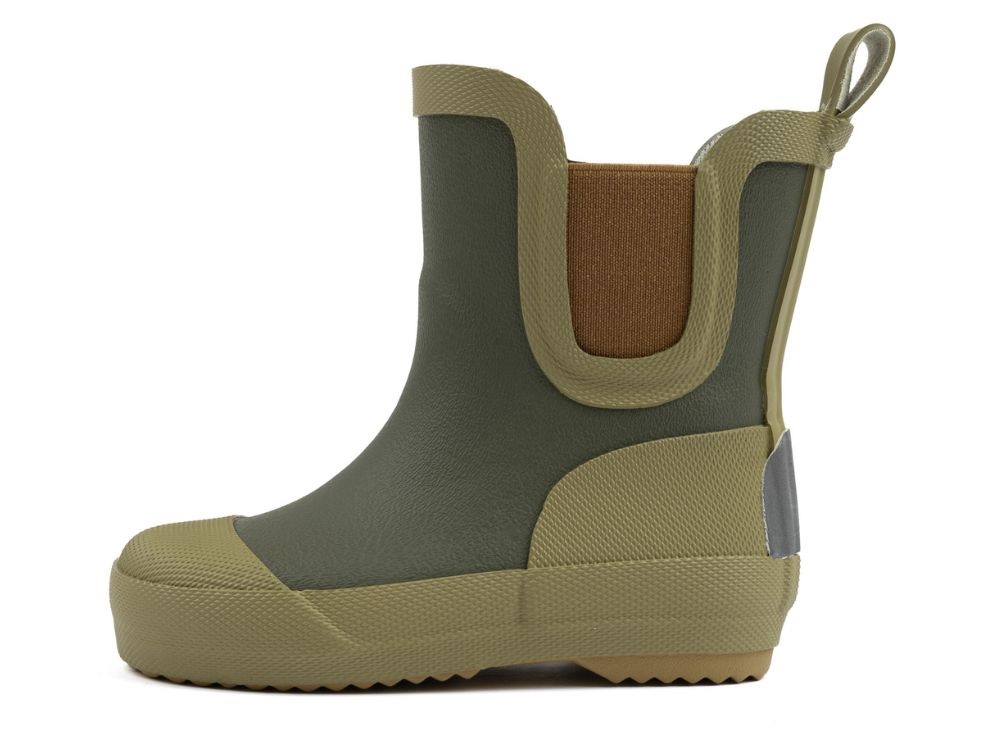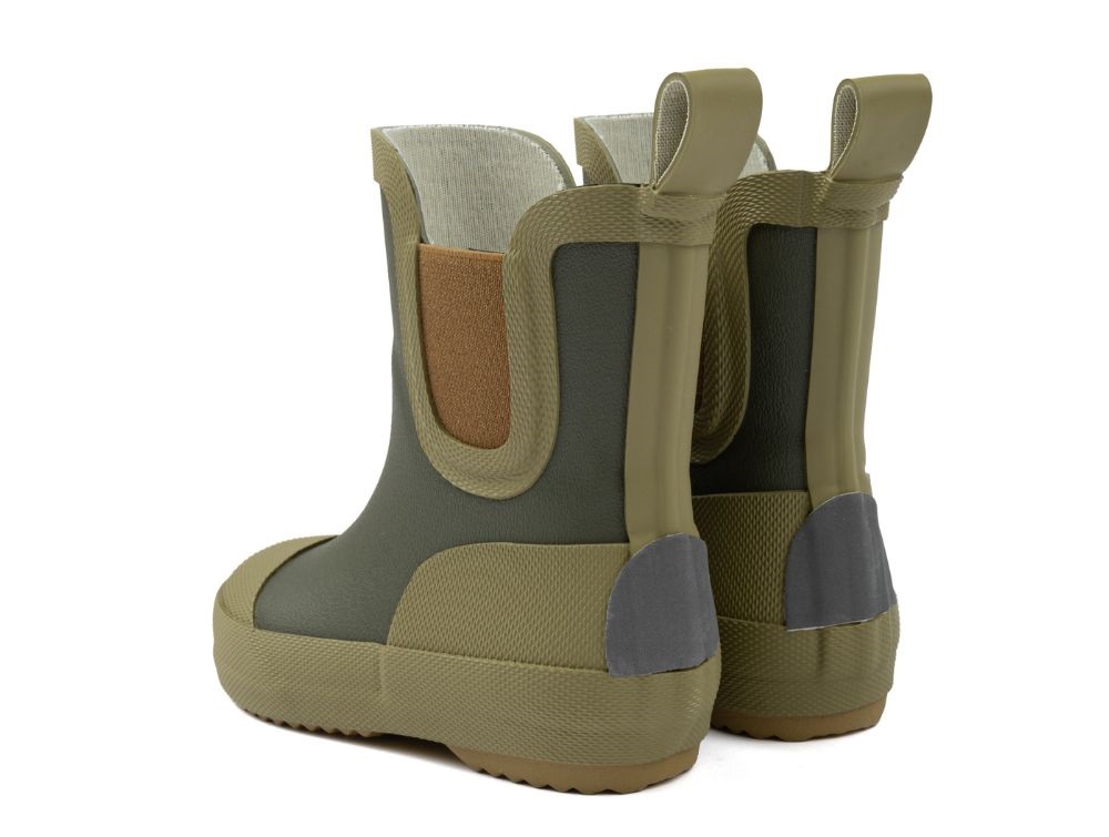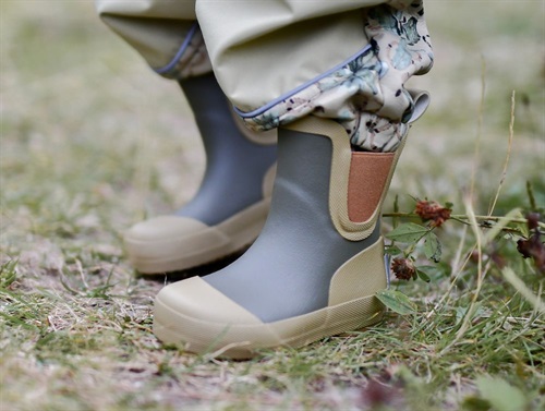 Korte gummistøvler i støvet oliven og grønne/brune nuancer i naturgummi fra Mikk-Line.