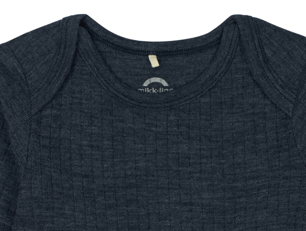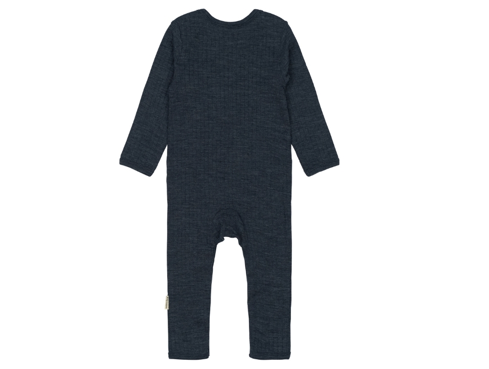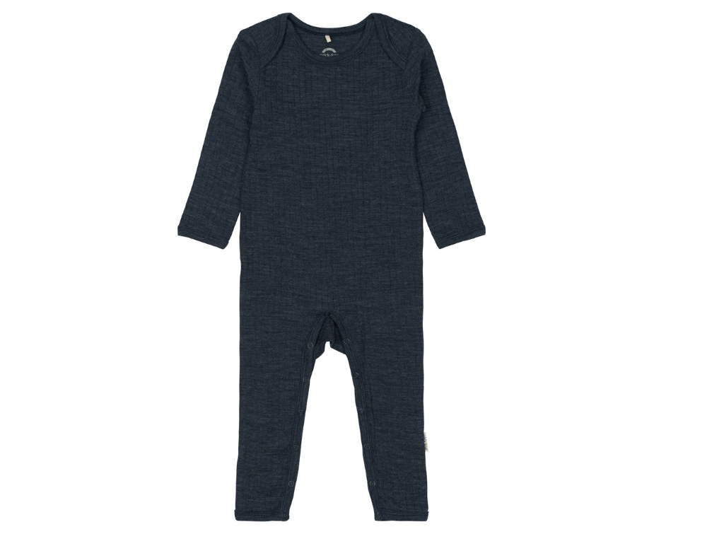 Heldragt i melange blue nights nuance fra Mikk-Line. Dragten er lavet i blød merinould med lange ærmer og praktiske trykknapper langs benet.