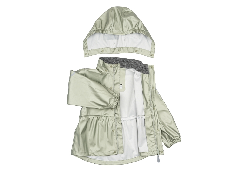 PU-regnsættet er fremstillet af 100% polyester (genanvendt) med PU-coating og har svejsede sømme, som gør det helt vandtæt med et vandsøjletryk på 3.000 mm. Den bløde fleece i kraven giver ekstra komfort, og det praktiske navneskilt har plads til flere navne, så regntøjet nemt kan gives videre til næste barn.