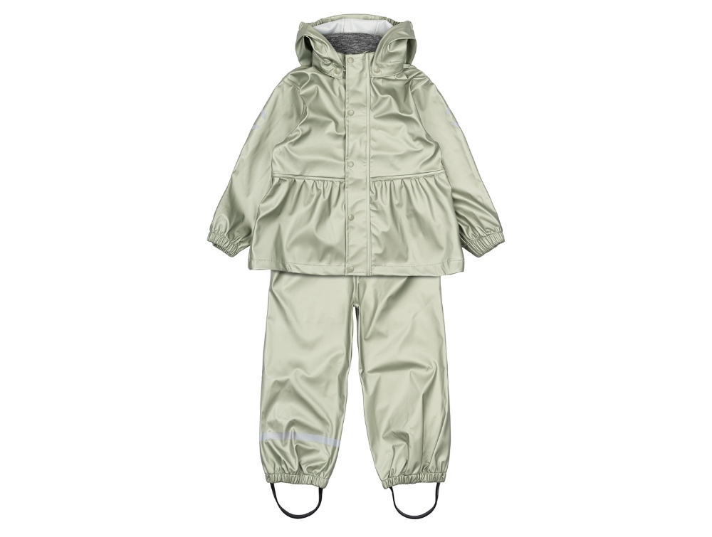 Regnsæt i grøn nuance med metallisk overflade fra Mikk-Line. Regnsættet består af jakke og bukser i PU-materiale, der giver børn frihed til at lege i regnvejr.
