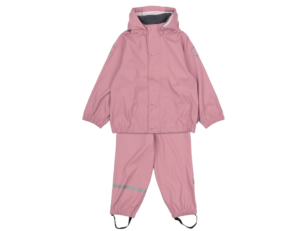 Mikk-Line regnsæt i lyserød nuance med refleksdetaljer og aftagelig hætte. Et praktisk sæt til regnvejrsdage. Bukserne i dette sæt er uden seler.