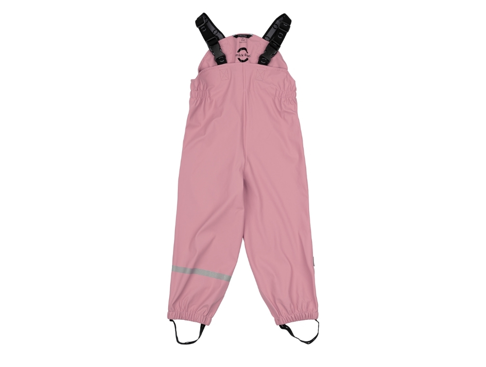 Mikk-Line regnsæt i lyserød nuance med seler. Regnsættet er lavet i et vandtæt materiale og designet til aktive børn, der elsker at lege ude i regnvejr og hoppe i vandpytter.