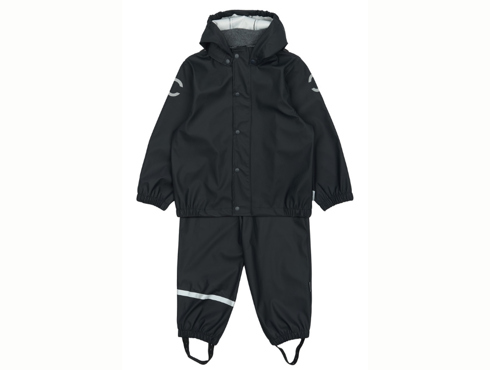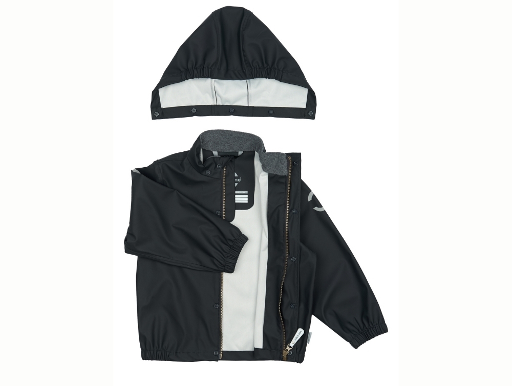 Det bløde PU-materiale er både vind- og vandtæt med svejsede sømme og en vandsøjle på 5.000 mm. Det er let at rengøre efter leg i vandpytter og mudder. Navnemærke indvendigt gør det muligt at lade sættet gå i arv.