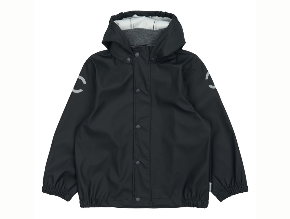 Jakken har lynlås med trykknapper foran, hagebeskytter og vindfang. Den aftagelige hætte sidder med trykknapper, og fleecekant ved halsen gør den ekstra behagelig at have på.
