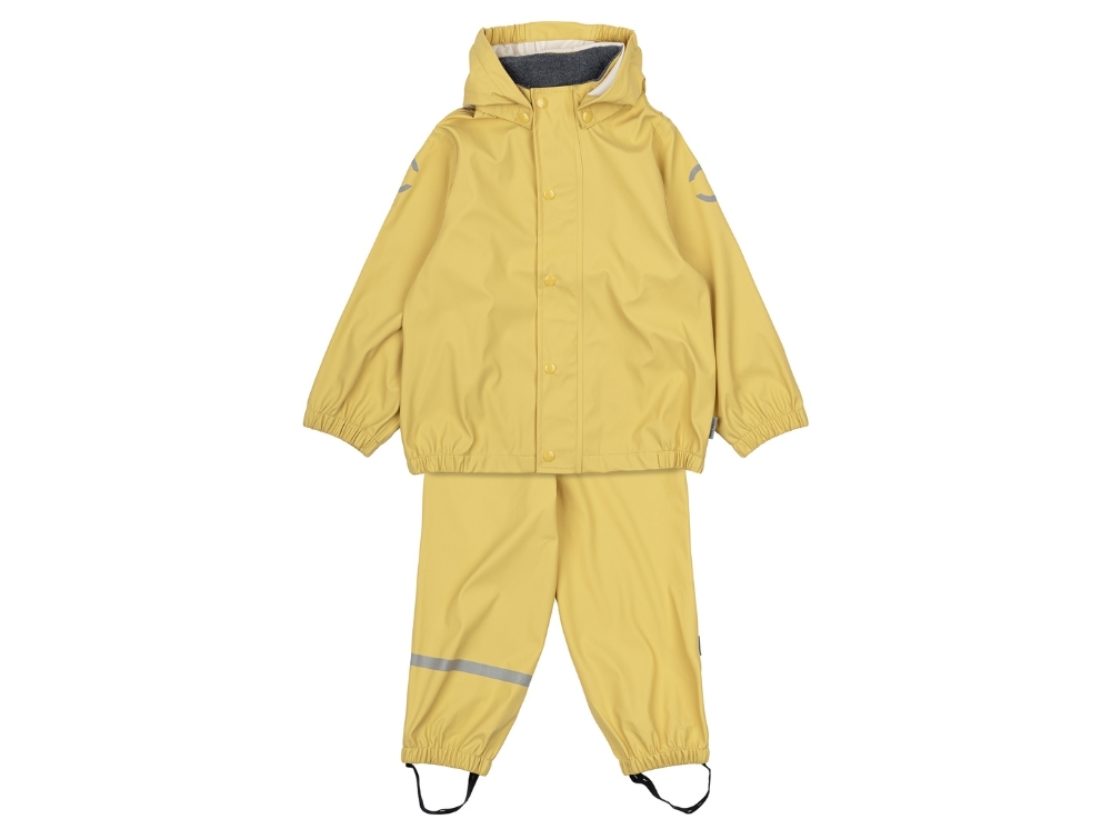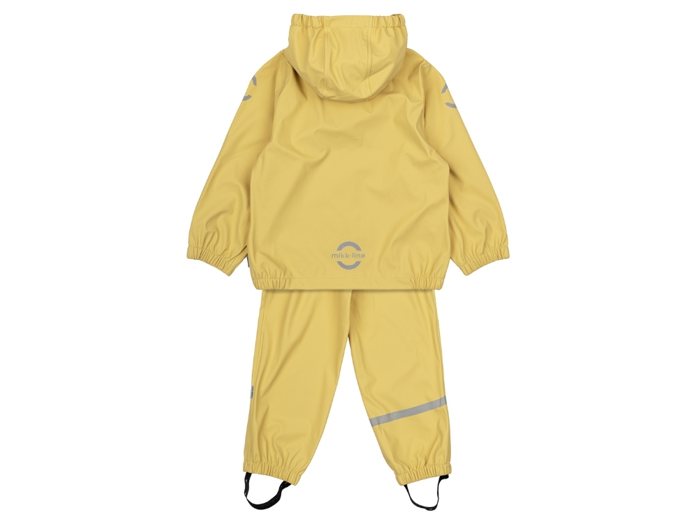 Mikk-Line regnsæt i gul nuance med refleksdetaljer og aftagelig hætte. Et funktionelt sæt til leg i regnvejr. Bukserne på dette sæt er uden seler.