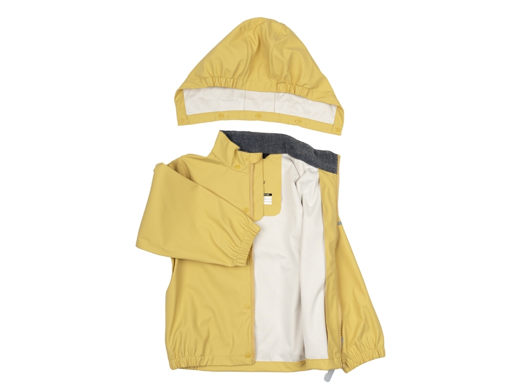 Yderstoffet er fremstillet af 58% GRS-certificeret genanvendt polyester, 30% polyurethan og 12% polyester, som gør regnsættet både slidstærkt og smudsafvisende. Det er vindtæt og let at rengøre. Indvendigt har regnjakken blødt fleecefor ved halsen for ekstra komfort. Sættet er OEKO-TEX® Standard 100 certificeret og fri for skadelige stoffer.