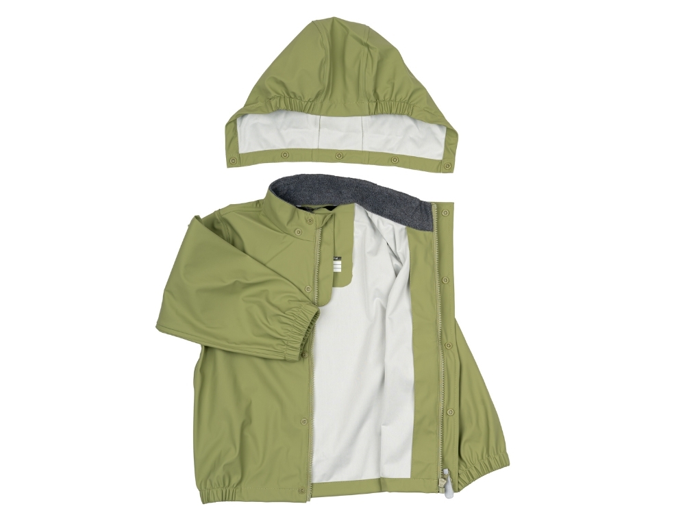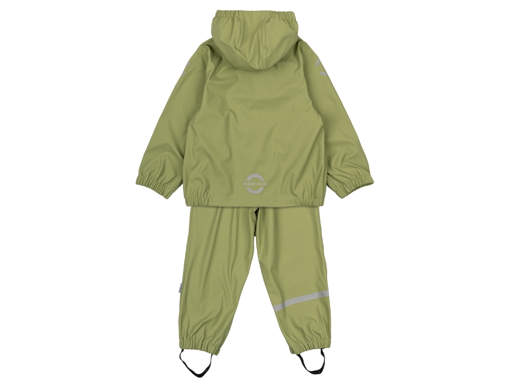 Mikk-Line regnsæt i grøn nuance med refleksdetaljer og aftagelig hætte. Et super fint sæt til regnvejr. Bukserne er uden seler.