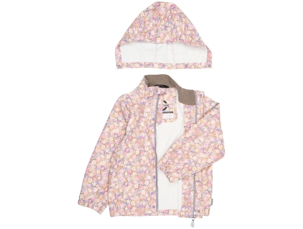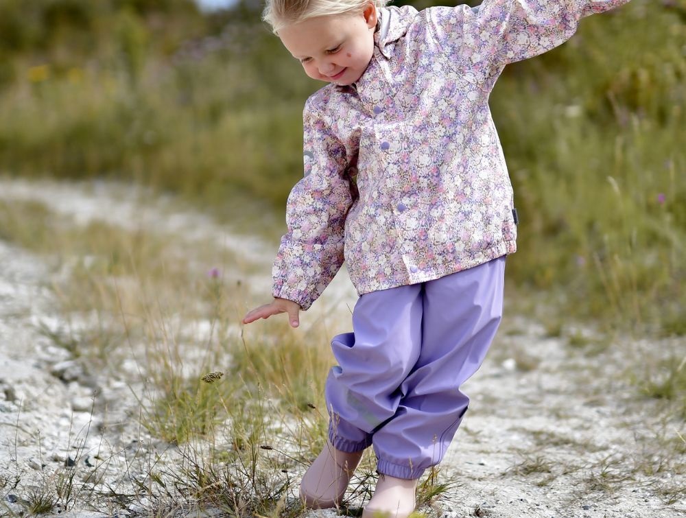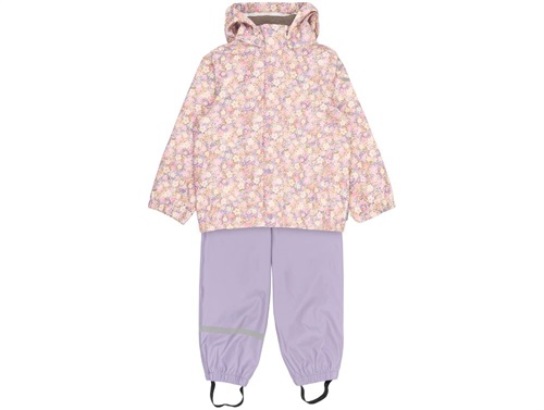 Regnsæt med fin blomstret regnjakke og lilla ensfarvede regnbukser fra Mikk-line.