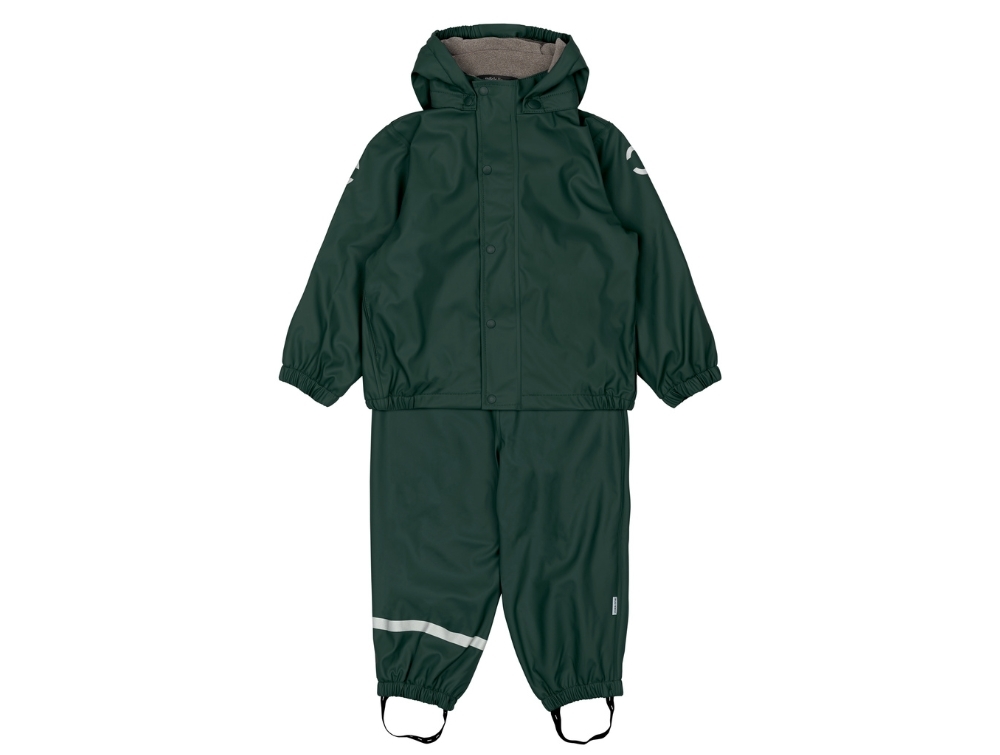 Mikk-Line regntøj i mørkegrøn nuance (darkest sprouse) med blødt fleecefor og praktiske seler på bukserne i størrelserne 74-104. Sættet er ideelt til regnfulde, kolde dage og aktiv leg udendørs.