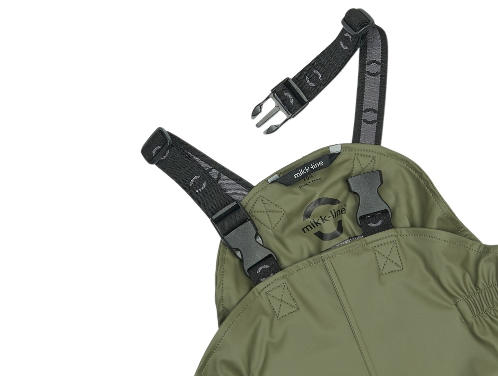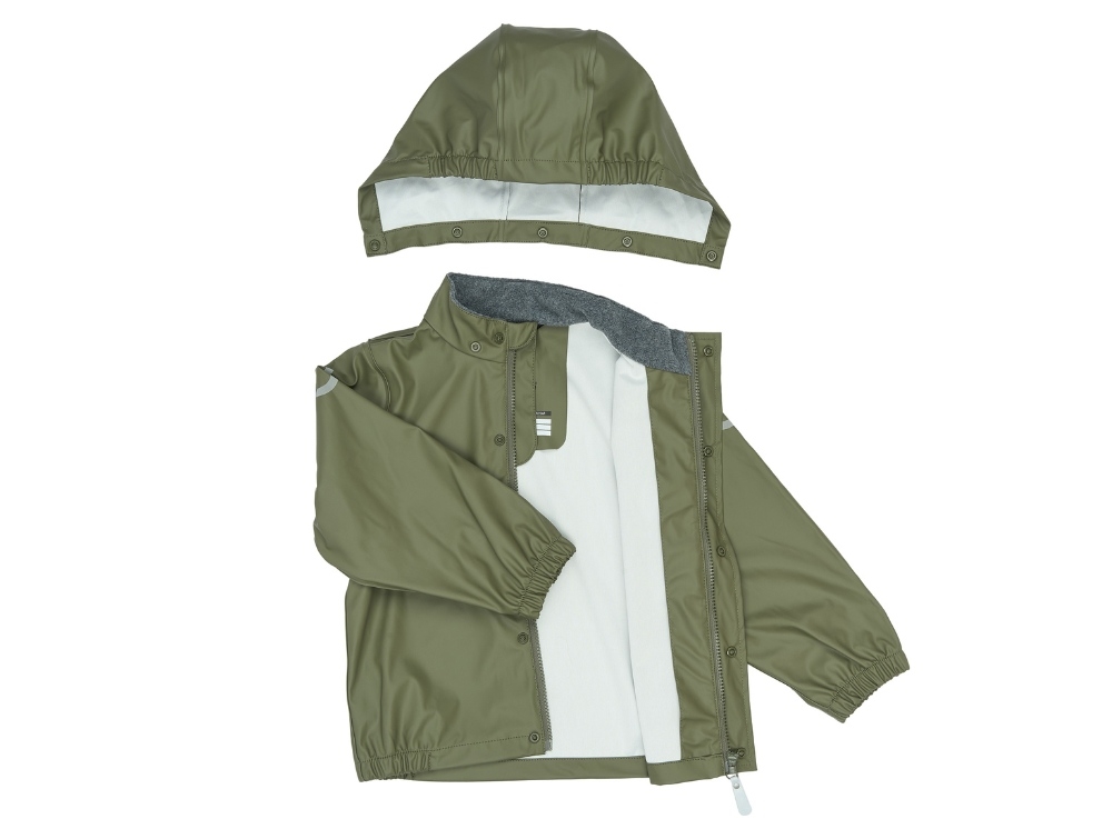 Regnsættet fra Mikk-Line er perfekt til regnfulde dage og leg i vandpytter. Det olivengrønne sæt består af en jakke med aftagelig hætte og bukser med seler og justerbare fodstropper. De brede seler har klikspænder, og jakken lukkes med lynlås og trykknapper. Fleecefor i nakken gør det ekstra behageligt. Jakken og bukserne har reflekser og elastik ved håndled og ankler, så vandet holdes ude.