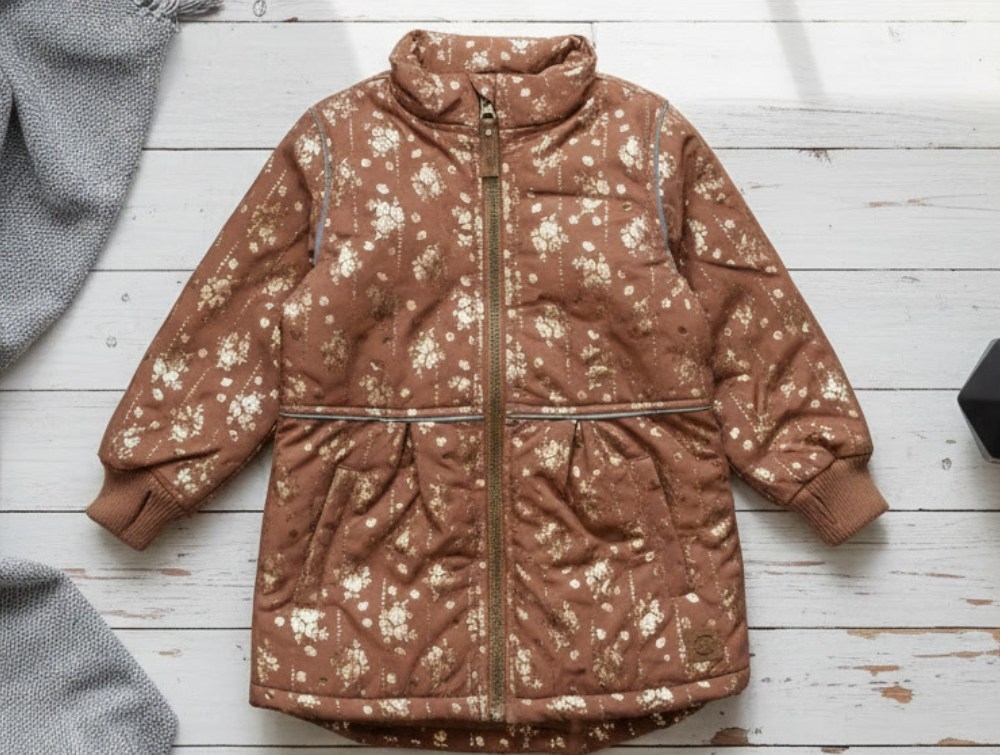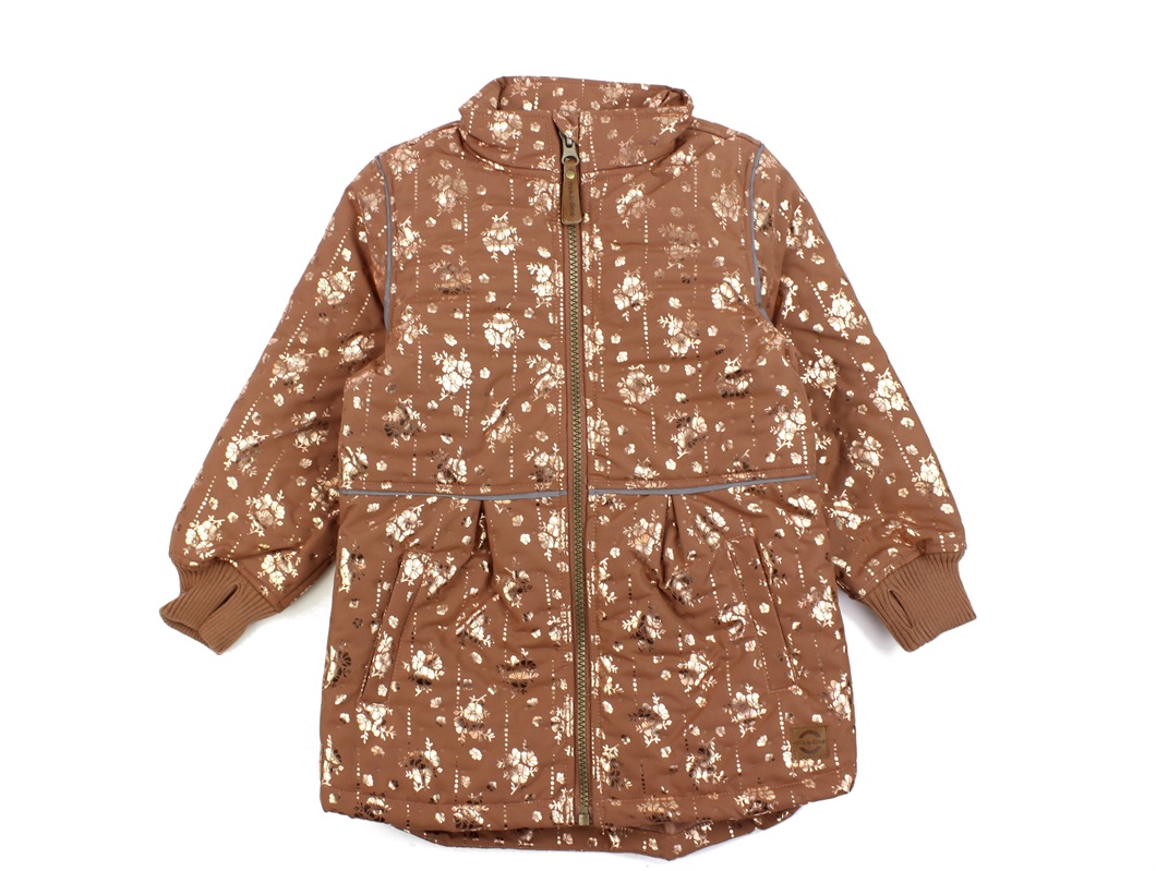Lang termojakke i farven russet med guld-blomsterprint fra Mikk-line.