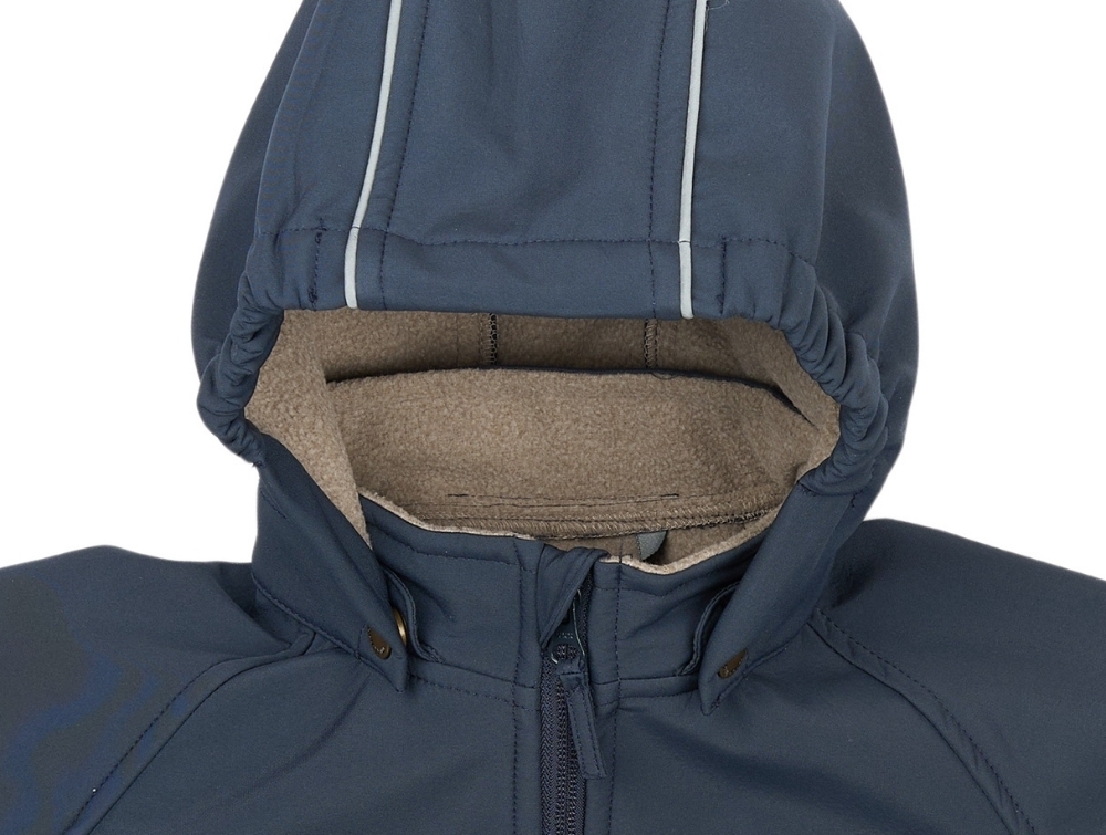 Mikk-line softshell jakke blue nights bæres af barn i naturenMikk-line softshell jakke blue nights med fleecefoerMikk-line softshell jakke blue nights logo detaljeMikk-line softshell jakke blue nights med aftagelig hætteMikk-line softshell jakke blue nights set bagfra