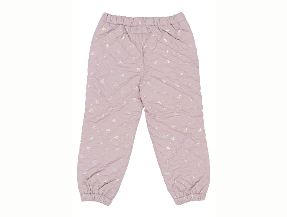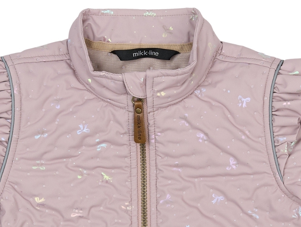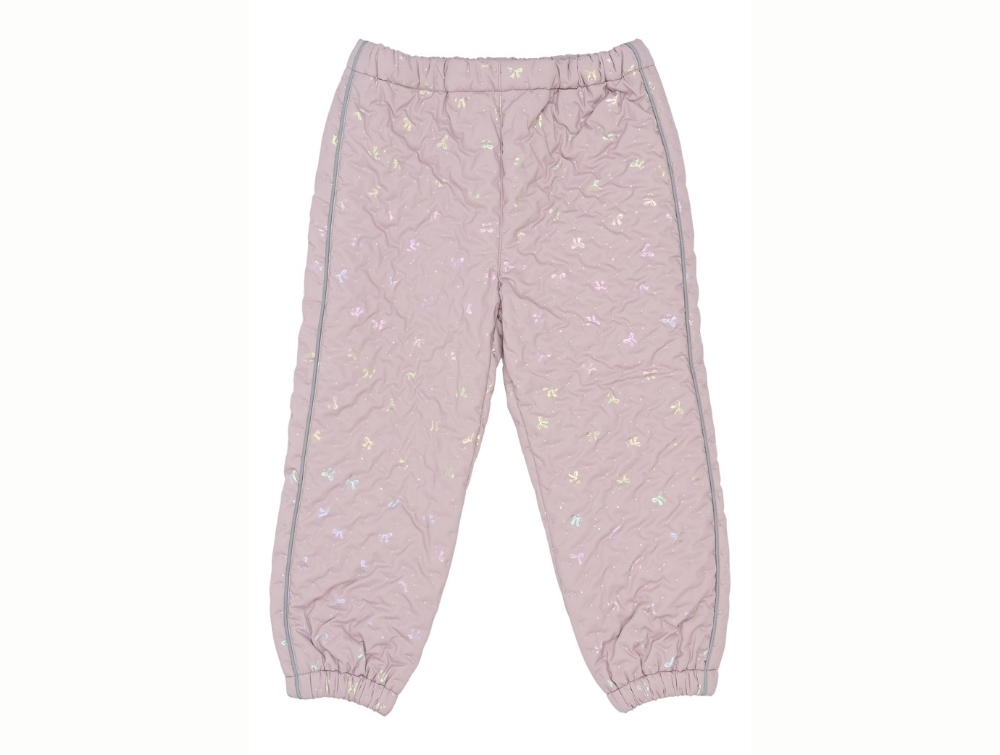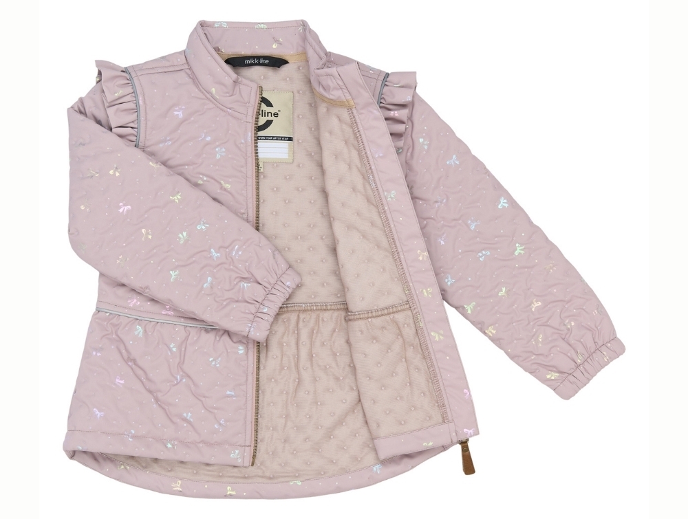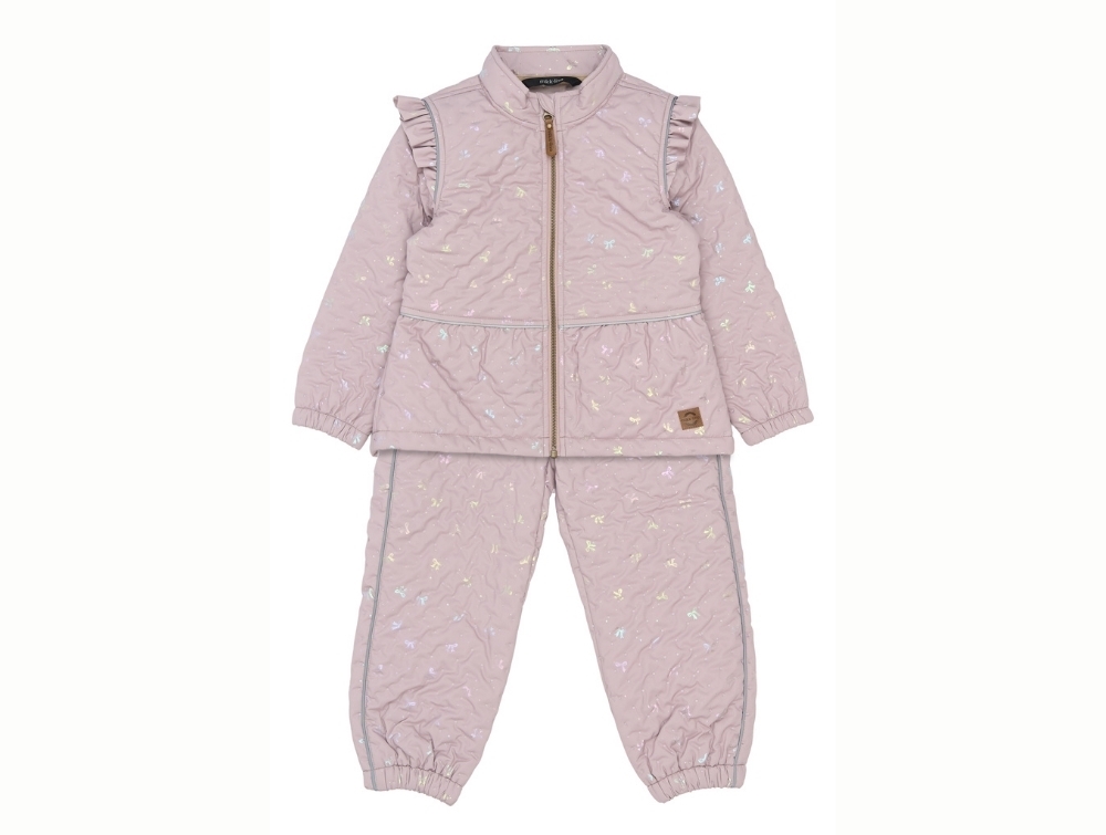 Mikk-line rosa termo frillsæt til piger med sløjfeprint set forfraMikk-line rosa termo jakke med flæser og foil-sløjferMikk-line termo jakke i rosa nuance set åben med quiltet foerMikk-line rosa termo bukser til piger med all-over sløjfeprintMikk-line rosa termo bukser set bagfra med aop-print