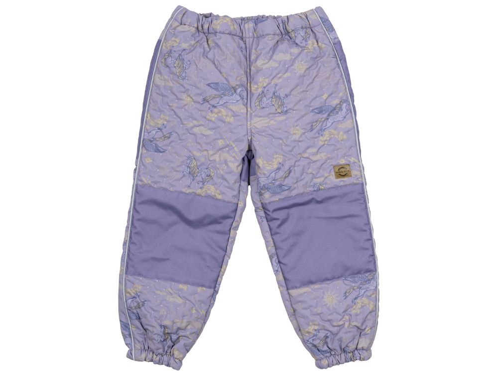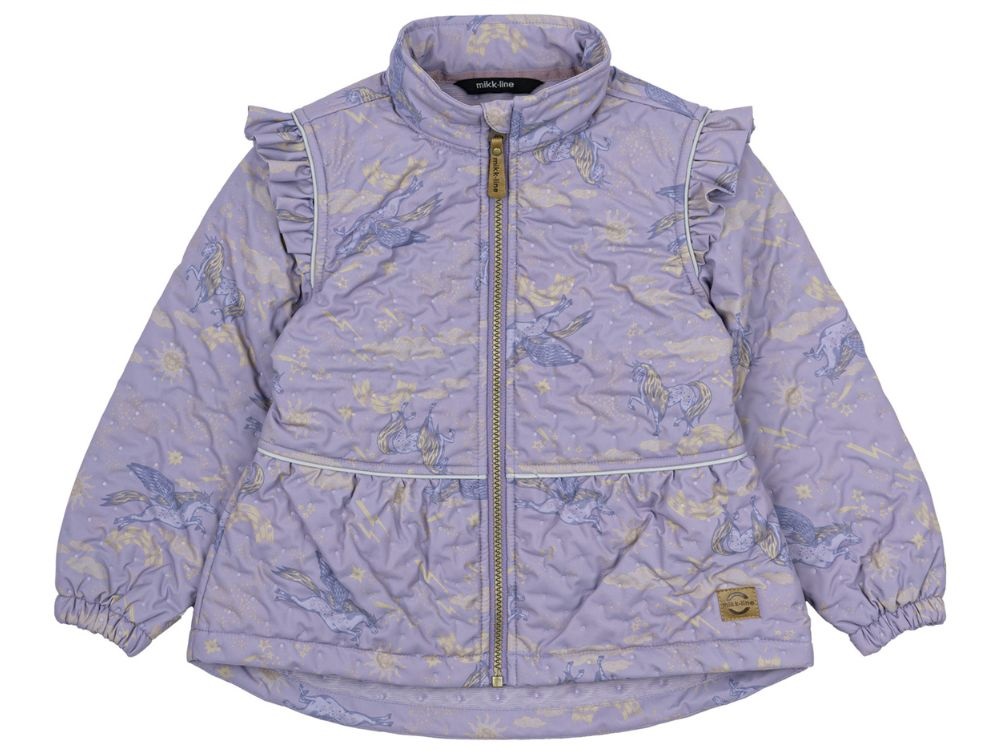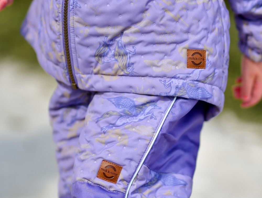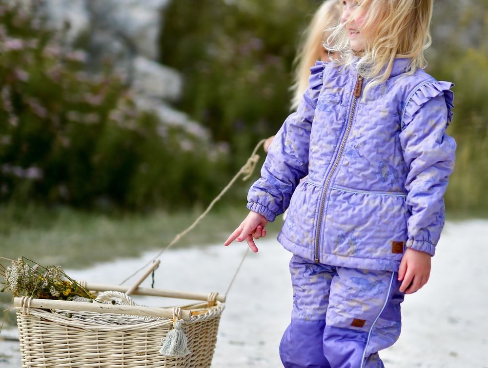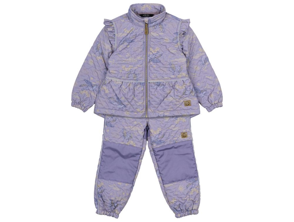 Flot og funktionelt termosæt fra Mikk-Line i en støvet lilla nuance med et eventyrligt enhjørningeprint i mørkelilla og gyldne nuancer. Sættet er designet med fine flæsedetaljer, der giver et feminint udtryk, samtidig med at det beskytter mod kulde og blæst. Det er fremstillet af 100% polyester og har en isolerende effekt, der gør det ideelt til overgangsperioder, hvor vejret er køligt og fugtigt.