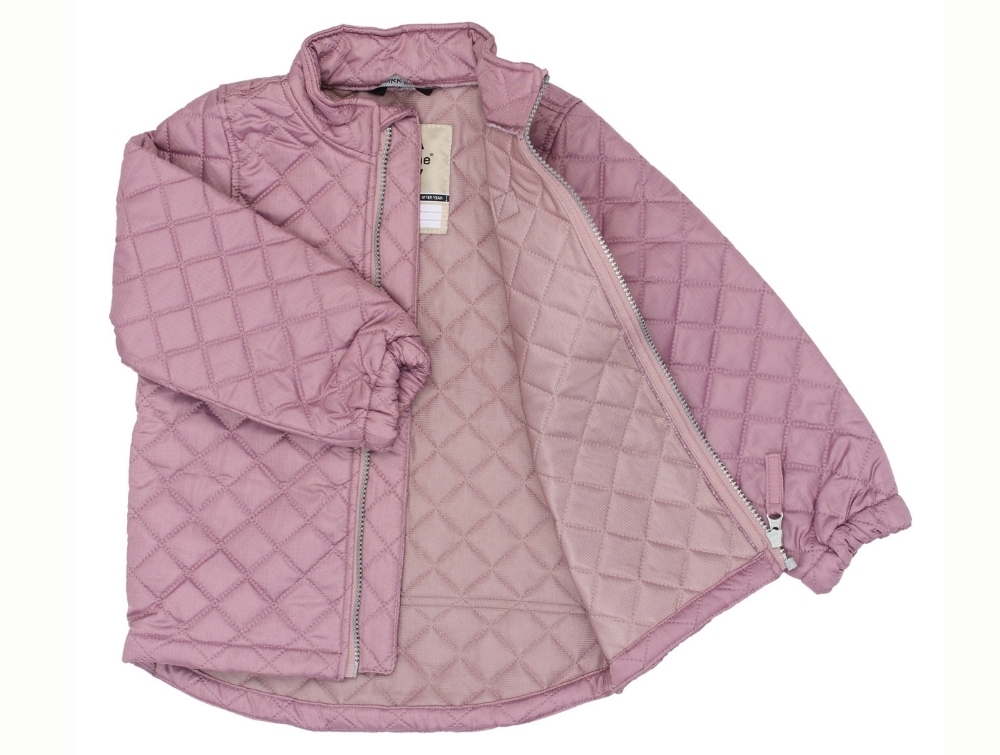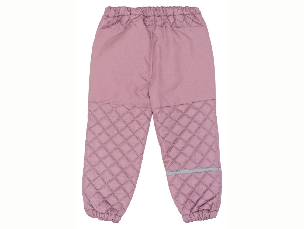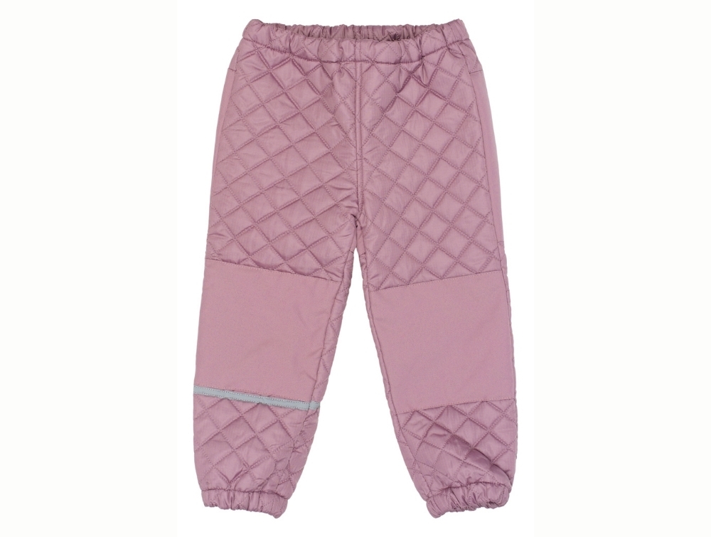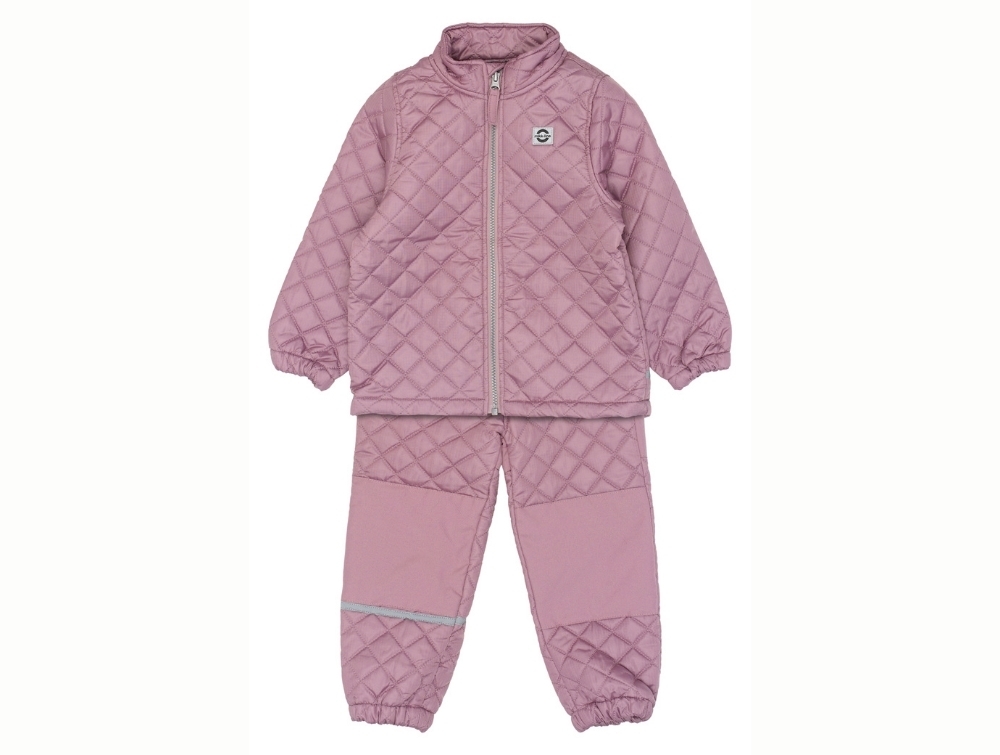 Termosæt i støvet rosa nuance (woodrose) fra Mikk-line med quiltet struktur og forstærkede paneler på knæ og bag.