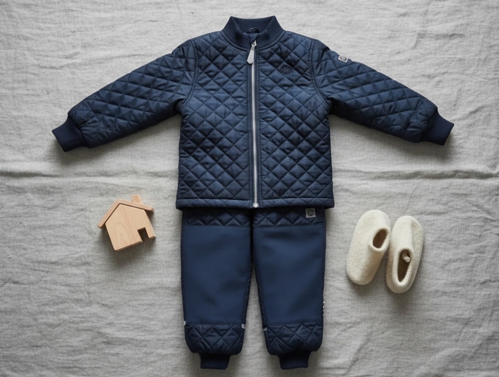 Termosæt i mørkeblå nuance (blue nights) fra Mikk-Line. Sættet er quiltet, har ribkanter og slidstærke forstærkninger på knæ og sæde, hvilket gør det oplagt til udendørsaktiviteter i overgangsperioder. Det er vindtæt og vandafvisende og har en unisex pasform, som gør det nemt at give videre.