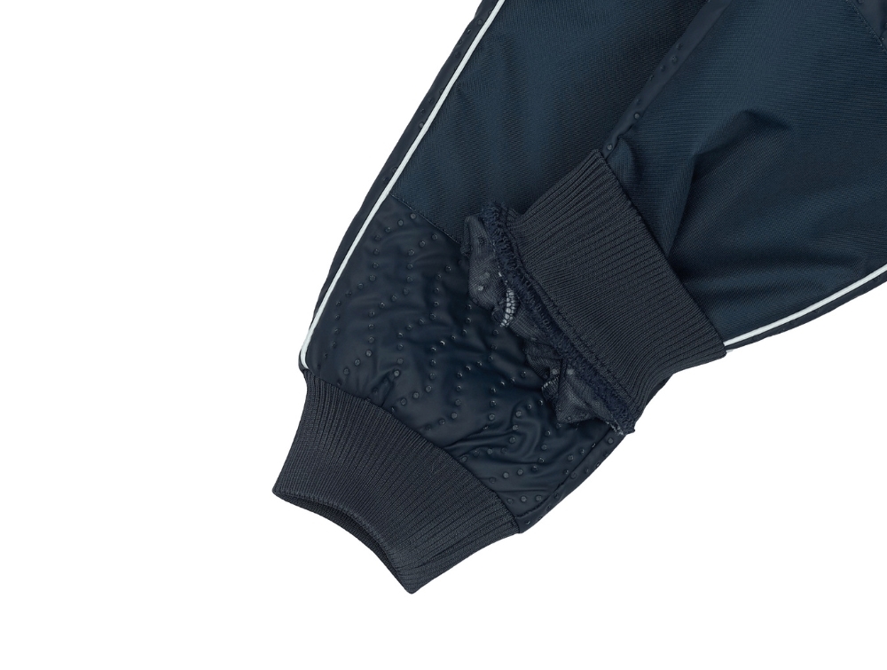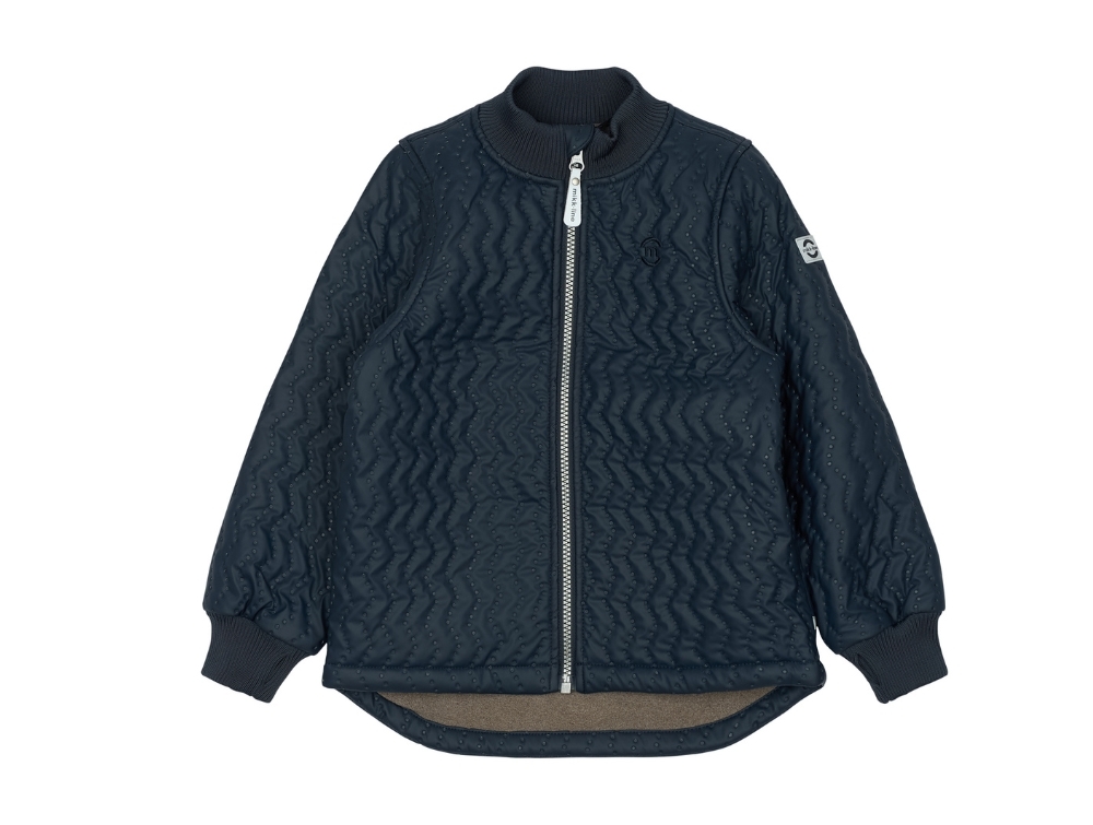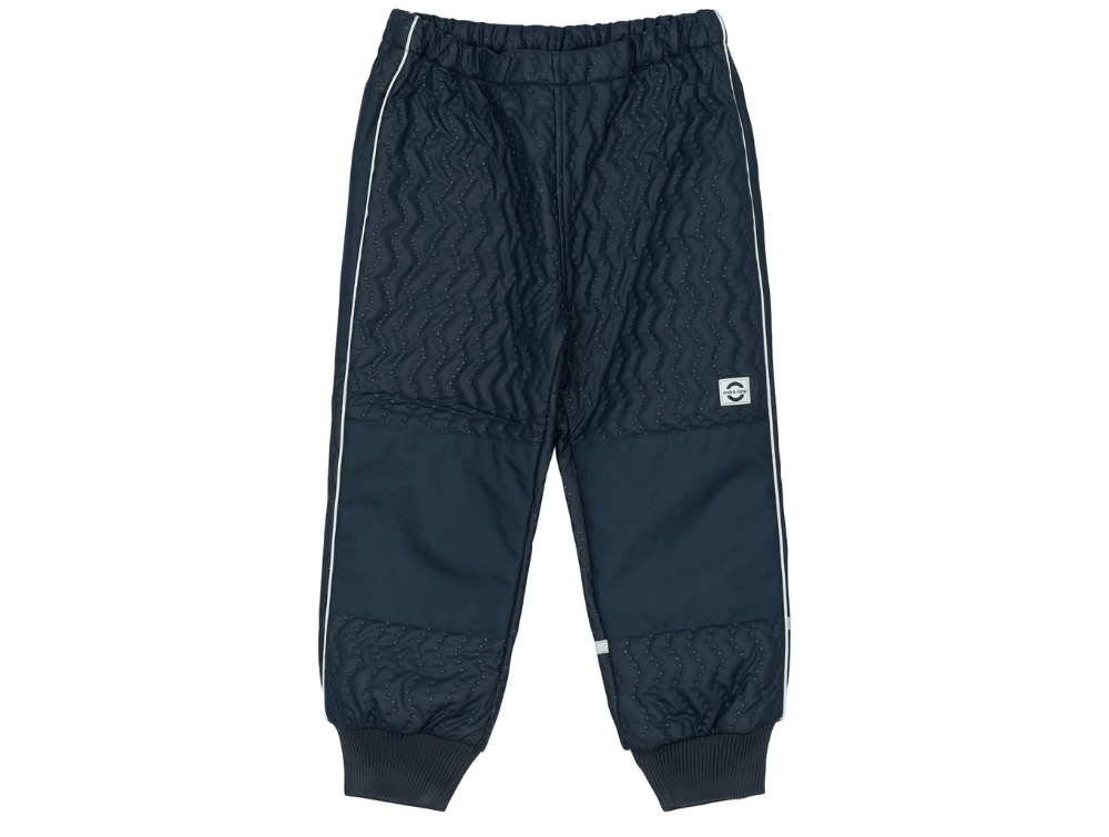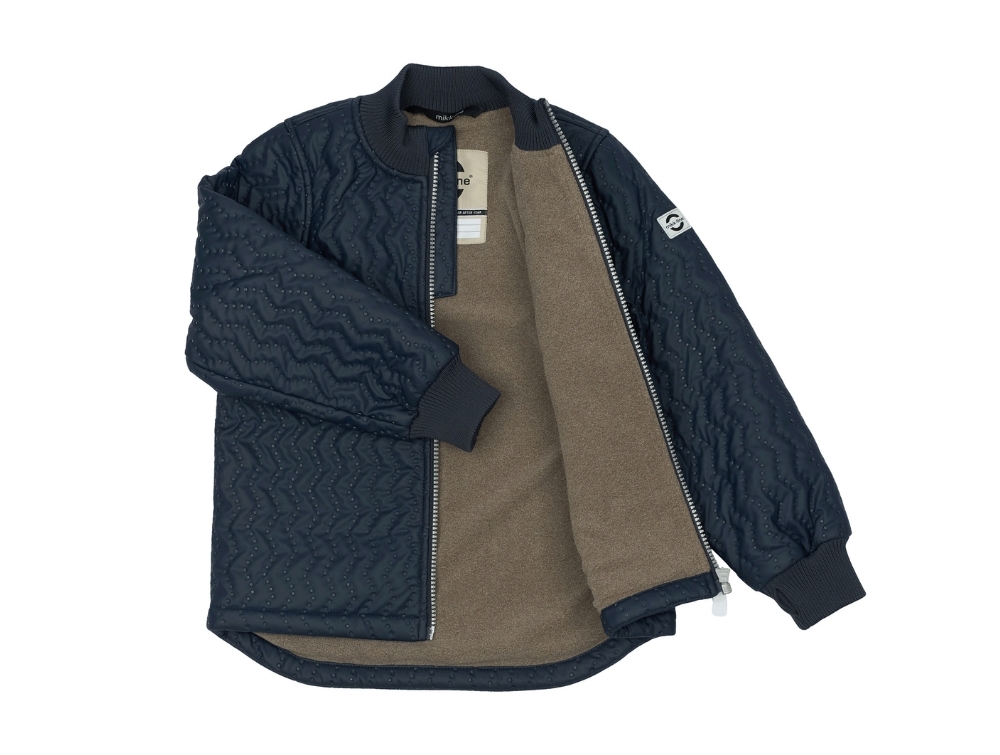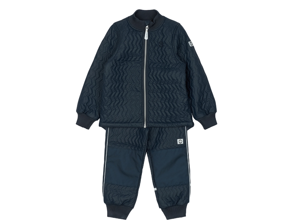 Mikk-Line termotøj i mørk blå nuance med quiltet overflade og blødt fleecefor i jakken. Termosættet er Mikk-Lines varmeste model og perfekt til udendørs leg i kolde, blæsende og våde vejrforhold.