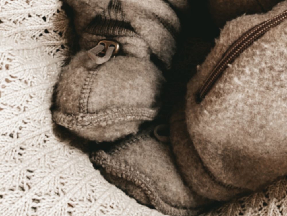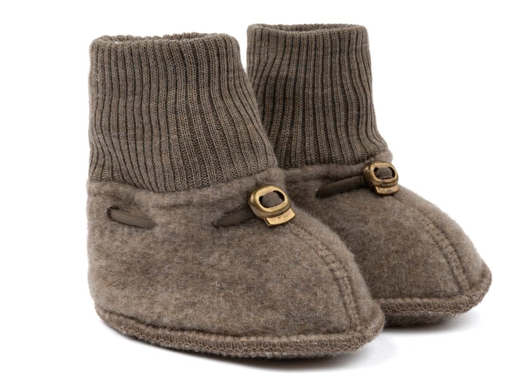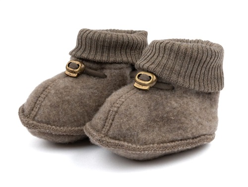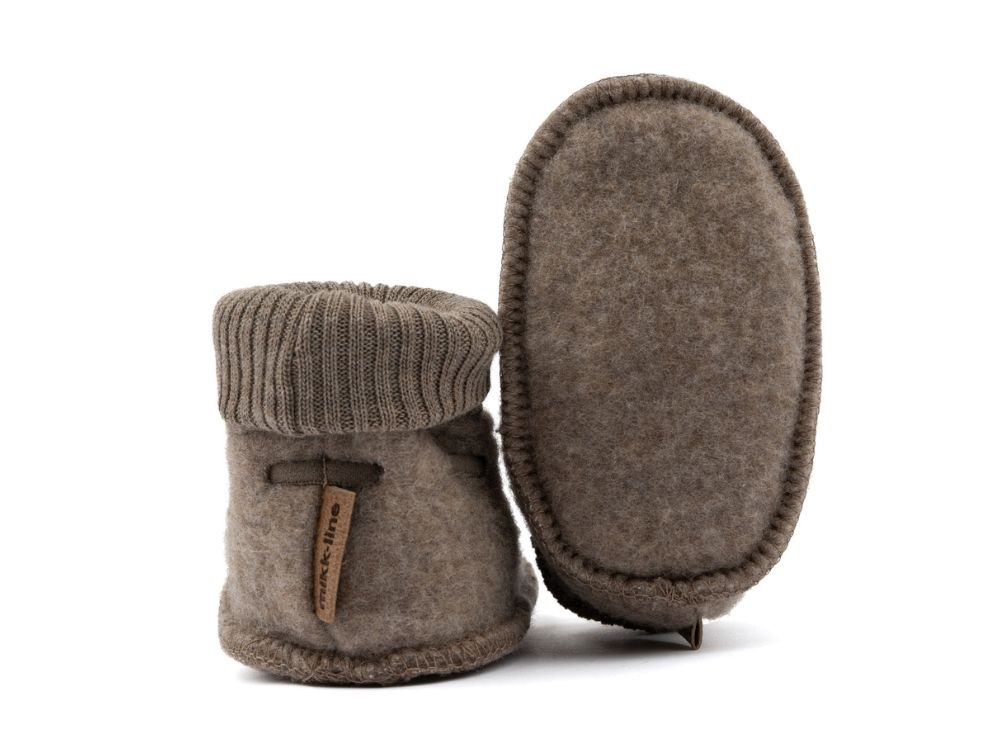 Mikk-Line uld futter i beige/brun nuance lavet i blødt uldmateriale med justerbar lukning og ribkant. Futterne har en enkel, ensfarvet stil og er velegnede til små babyfødder.