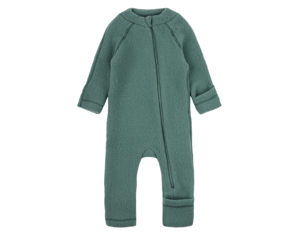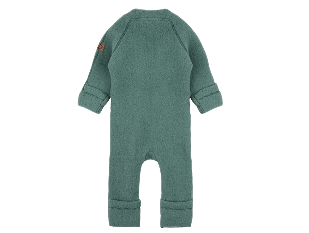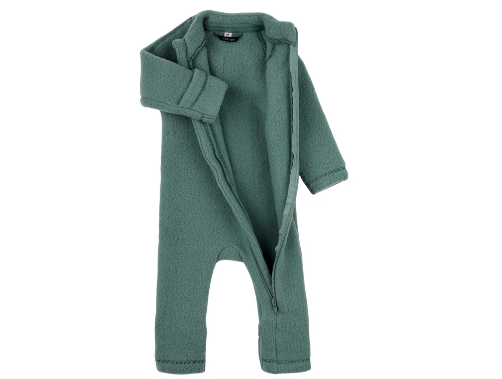 Mikk-Line ulddragt i grøn nuance (balsam green) lavet i blød merinould uden mulesing. Dragten har vendbare ærme- og benkanter, som kan foldes over og lukkes omkring hænder og fødder.