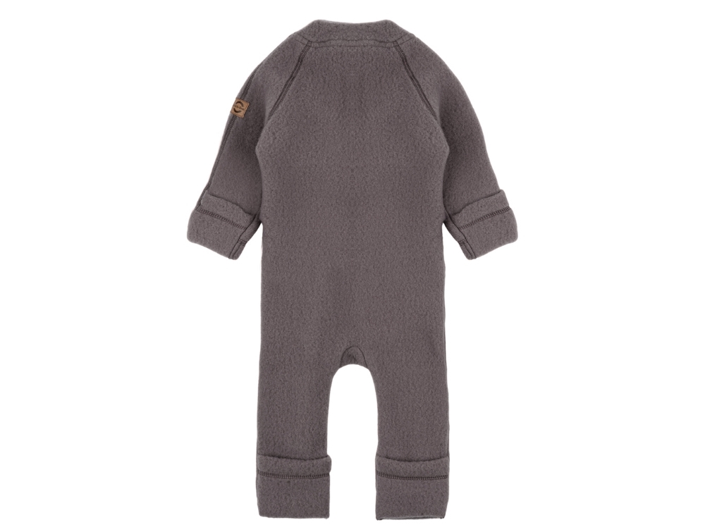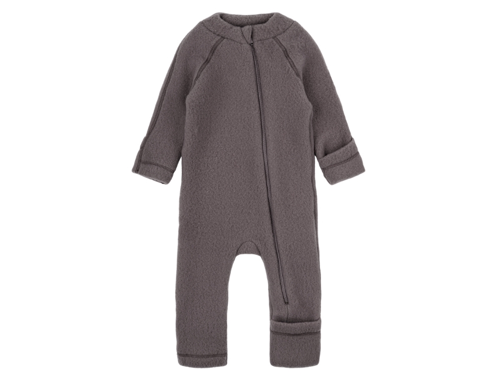 Mikk-Line ulddragt i gråbrun nuance med lilla toner (sparrow) lavet i blød merinould uden mulesing. Dragten har en lang YKK-lynlås og praktiske vendbare ærme- og benkanter, som kan foldes over hænder og fødder.