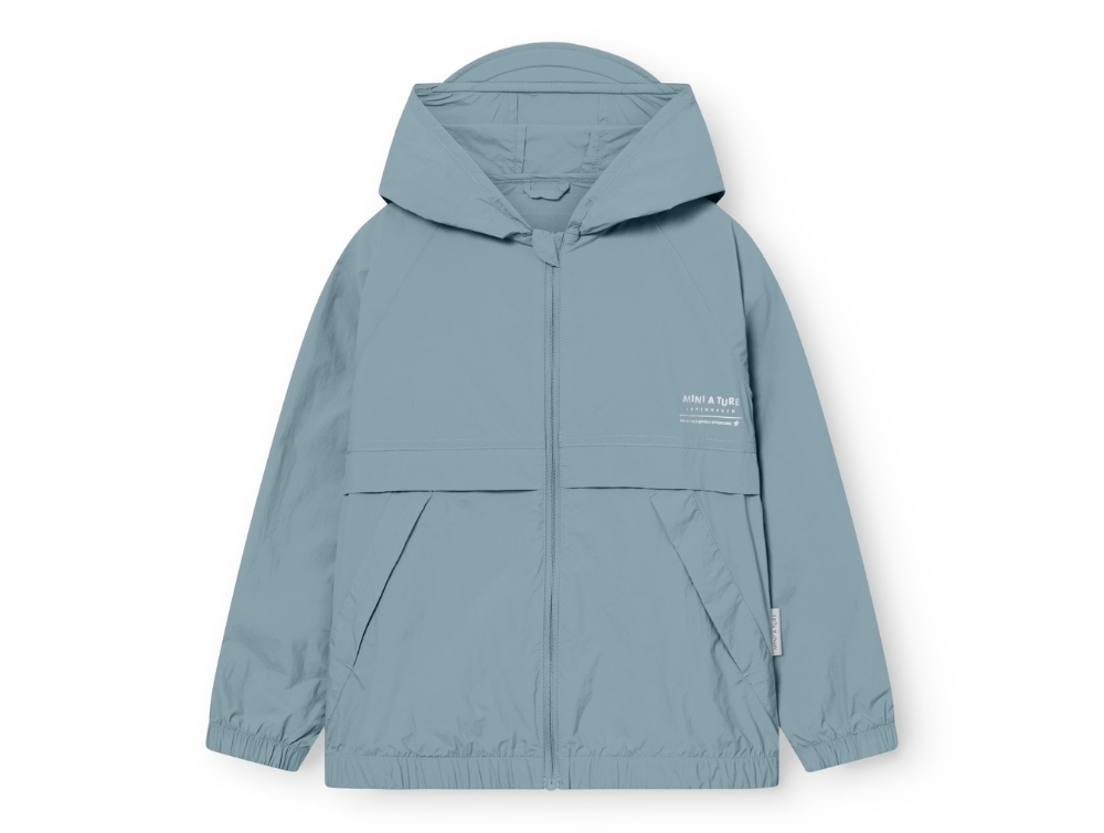 Jakken er fremstillet i et let materiale med UV40-beskyttelse, som hjælper med at skærme barnets hud mod solens stråler. Hætten har en lille skyggekant foran for ekstra beskyttelse, og bagpå er der en åbning, som giver plads til hestehale eller opsat hår. Foran har jakken skrå lommer og et diskret Mini A Ture-reflekslogo.