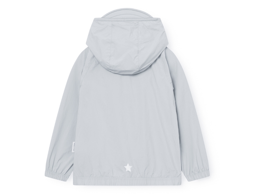 Jakken er fremstillet i et let materiale med UV40-beskyttelse, som hjælper med at skærme barnets hud mod solens stråler. Hætten har en lille skyggekant foran for ekstra beskyttelse, og bagpå er der en åbning, som giver plads til hestehale eller opsat hår. Foran har jakken skrå lommer og et diskret Mini A Ture-reflekslogo.