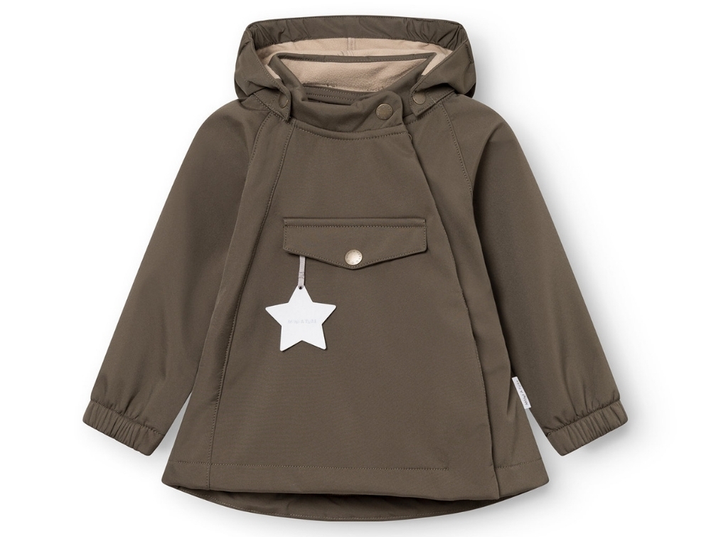 Softshell overgangsjakke i støvet mørk grøn nuance (tarmac green) fra Mini A Ture med aftagelig spids hætte og ikonisk stjernerefleks.