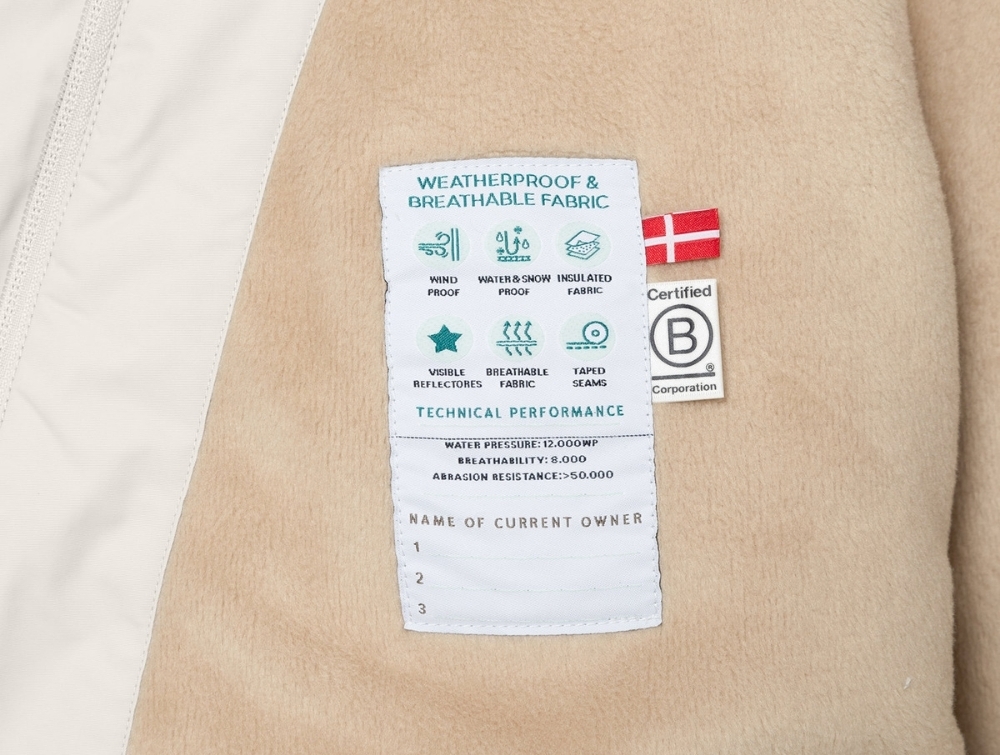 Vinterjakken er fremstillet i genanvendte materialer og har BIONIC FINISH ECO-imprægnering, som er fri for fluorstoffer. Jakken har en vandtæthed på 12.000 mm, åndbarhed på 8.000 g/m²/24t og en slidstyrke testet til 50.000+ Martindale. Alle sømme er tapede, hvilket gør jakken ekstra velegnet til vintervejr. Er certificeret med OEKO-TEX® Standard 100.