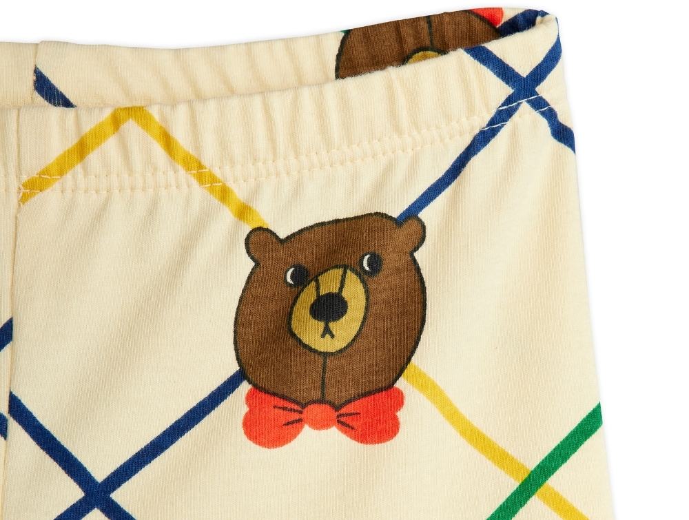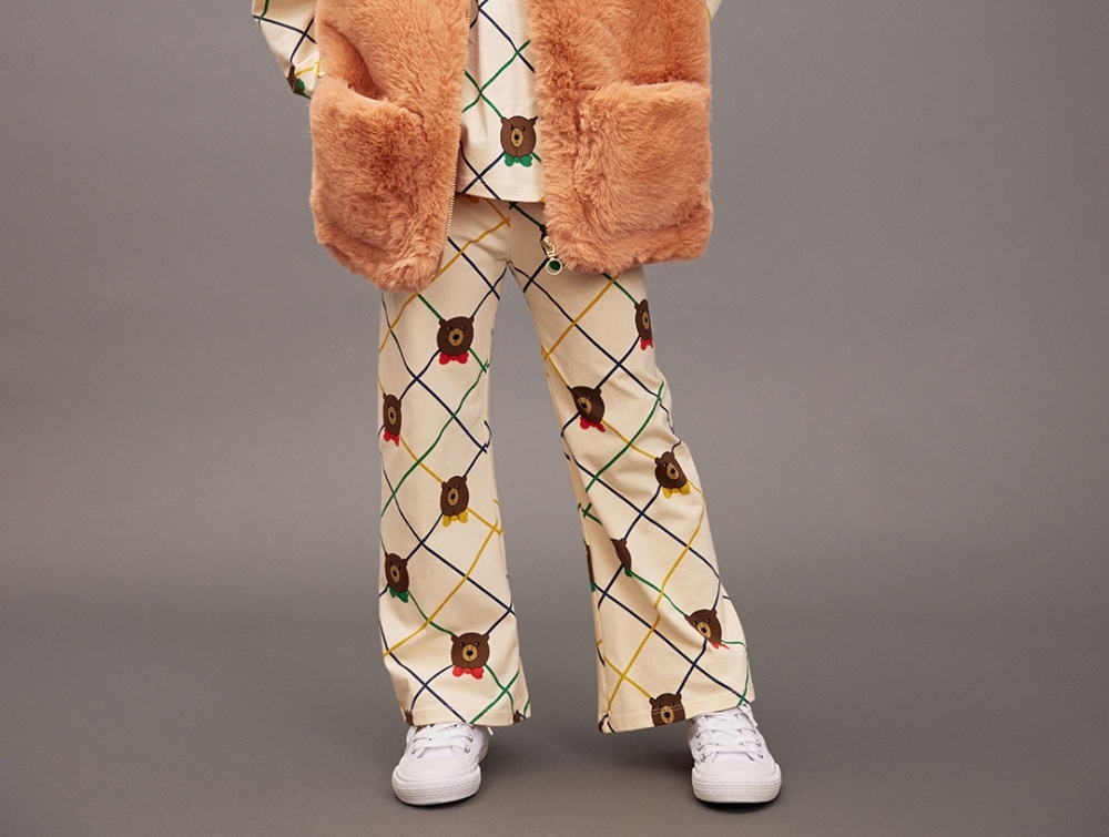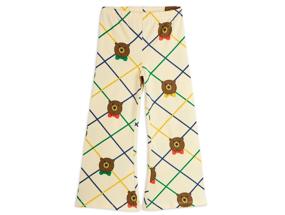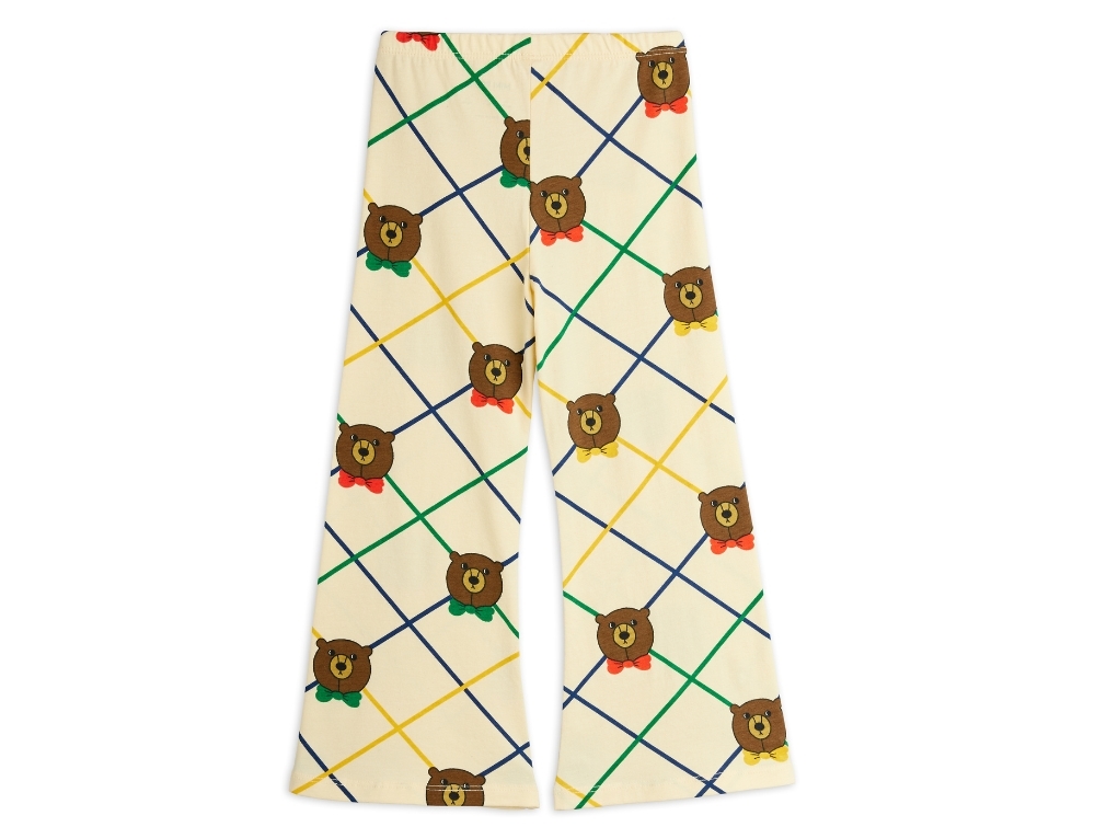 Flared bukser i råhvid fra Mini Rodini med ternemønster og farvede bjørne med sløjfer.