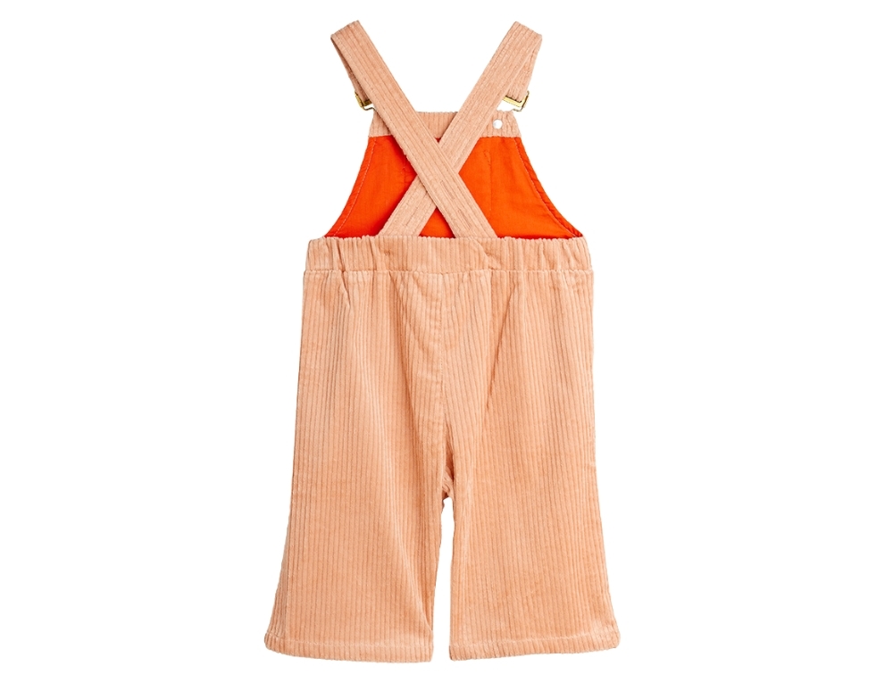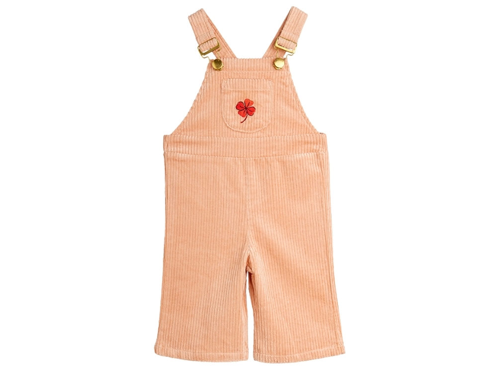 Barn iført peachfarvede fløjlsdungarees fra Mini Rodini med firkløverbroderiDungarees fra Mini Rodini i peachfarvet fløjl med firkløver set forfra Dungarees fra Mini Rodini i peachfarvet fløjl med firkløver set bagfra