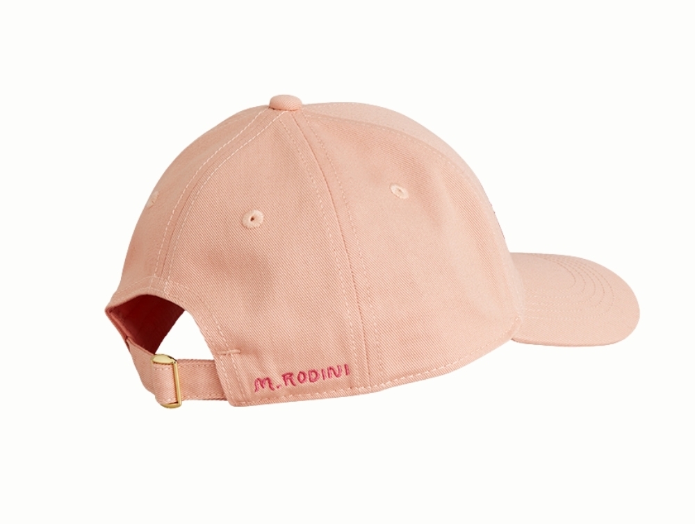 Pige iklædt Mini Rodini kasket i pink med to the moon broderiMini Rodini kasket i pink med to the moon broderi set forfraMini Rodini kasket i pink med broderet to the moon tekstMini Rodini kasket i pink med justerbar lukning set bagfra
