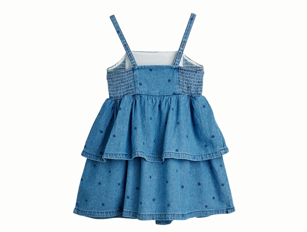 Pige iklædt Mini Rodini kjole i blue med prikprint og stropper Mini Rodini kjole i blue med prikprint og stropper set forfraMini Rodini kjole i blue med prikprint detalje af stofMini Rodini kjole i blue med prikprint set bagfra