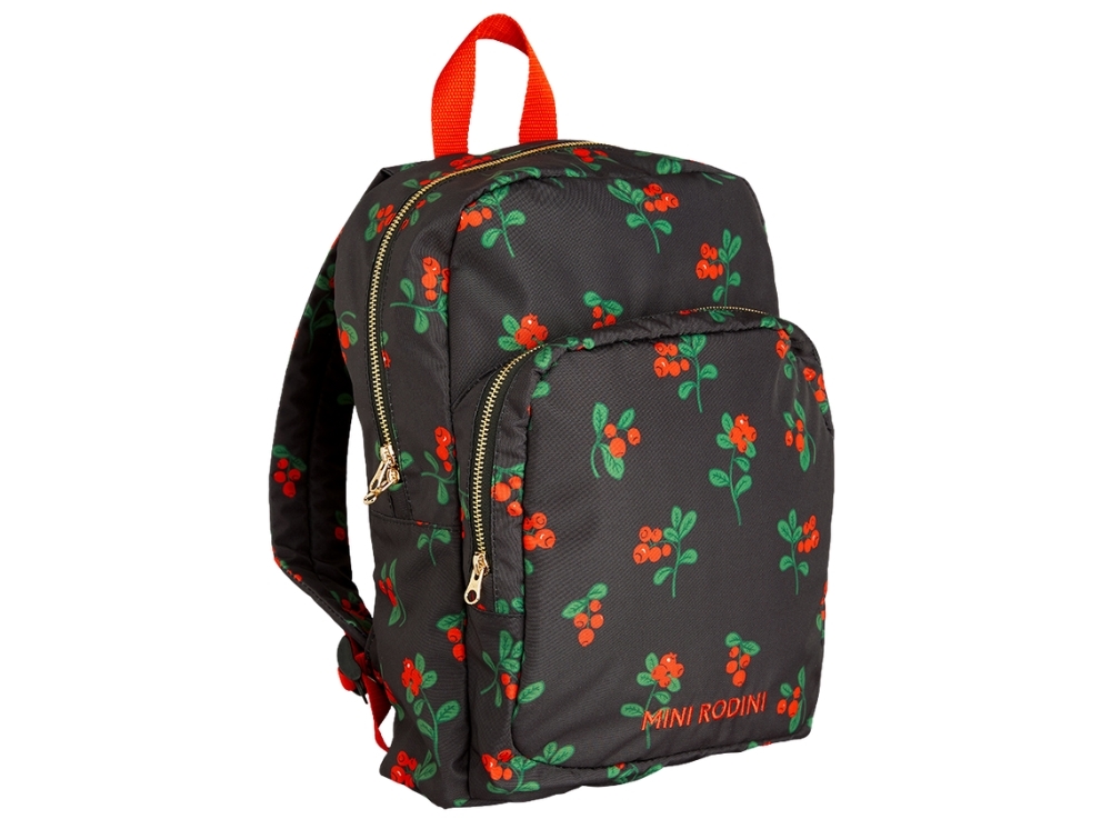 Mere information om Mini Rodini rygsæk sort med tyttebærprint og broderet logo