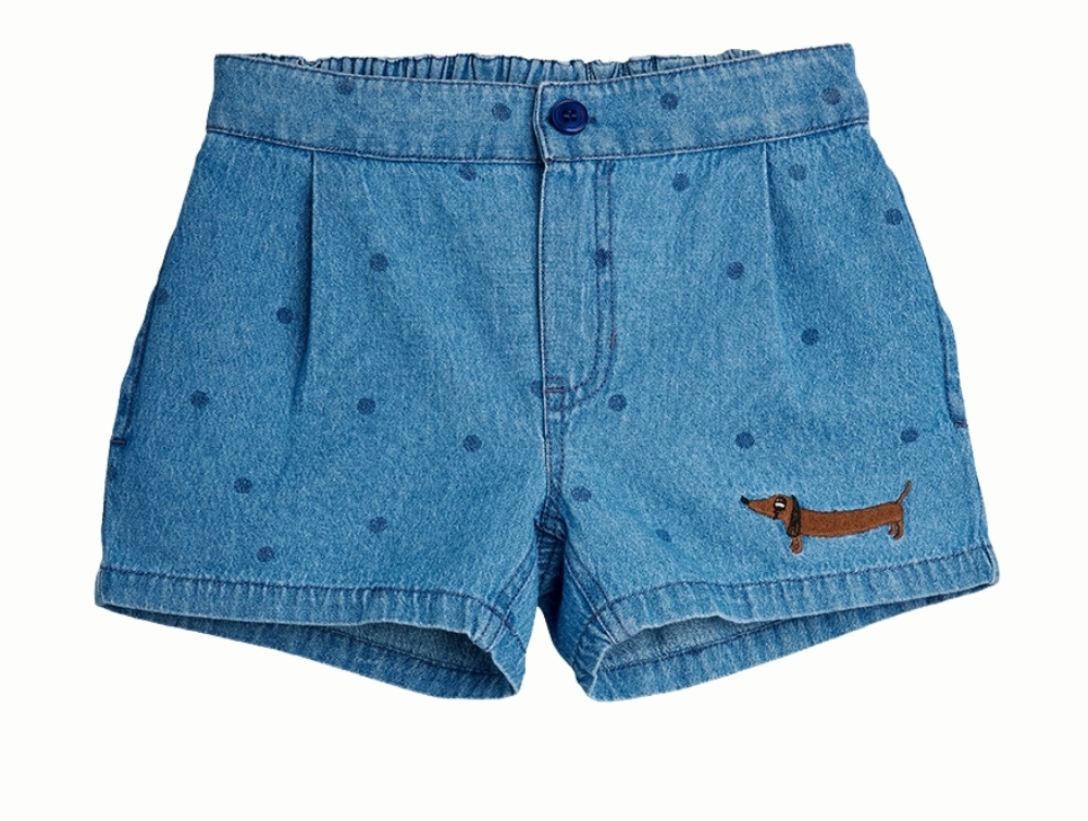 Shorts i blå fra Mini Rodini med all-over prikker og lille broderet hundedetalje på benet.