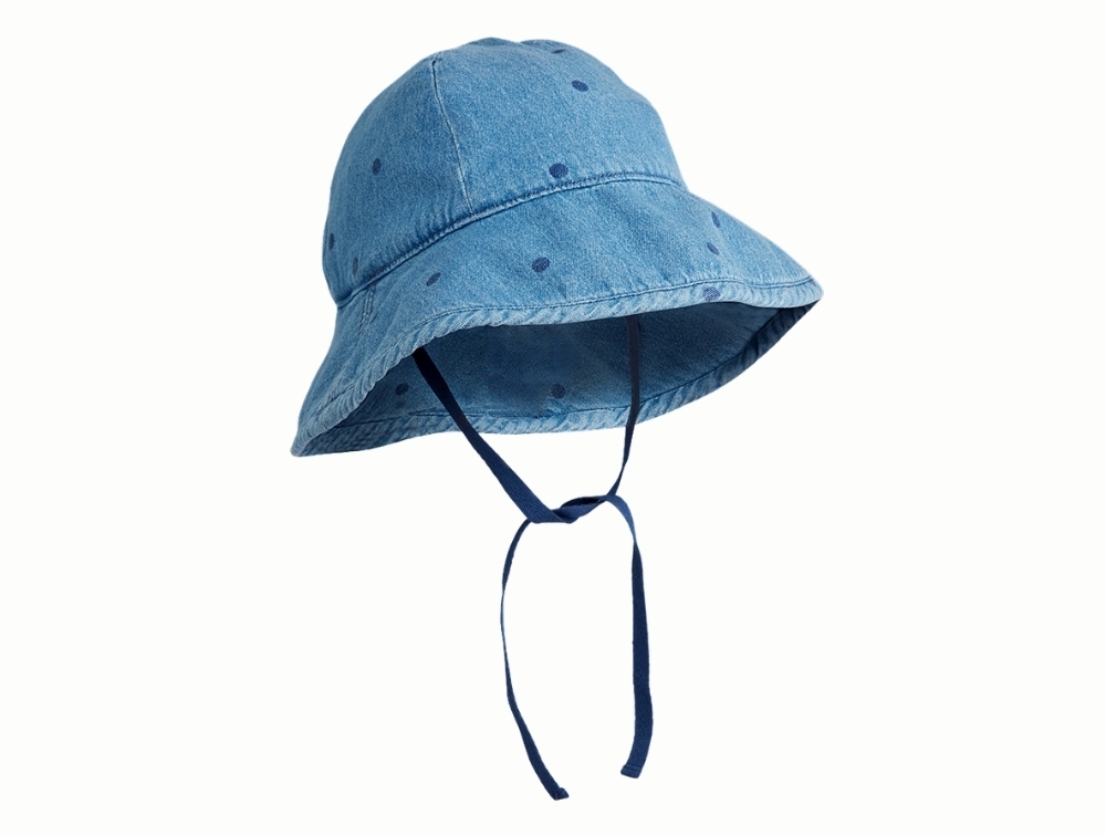 Solhat i blå nuance fra Mini Rodini med all-over prikker og bindebånd under hagen.