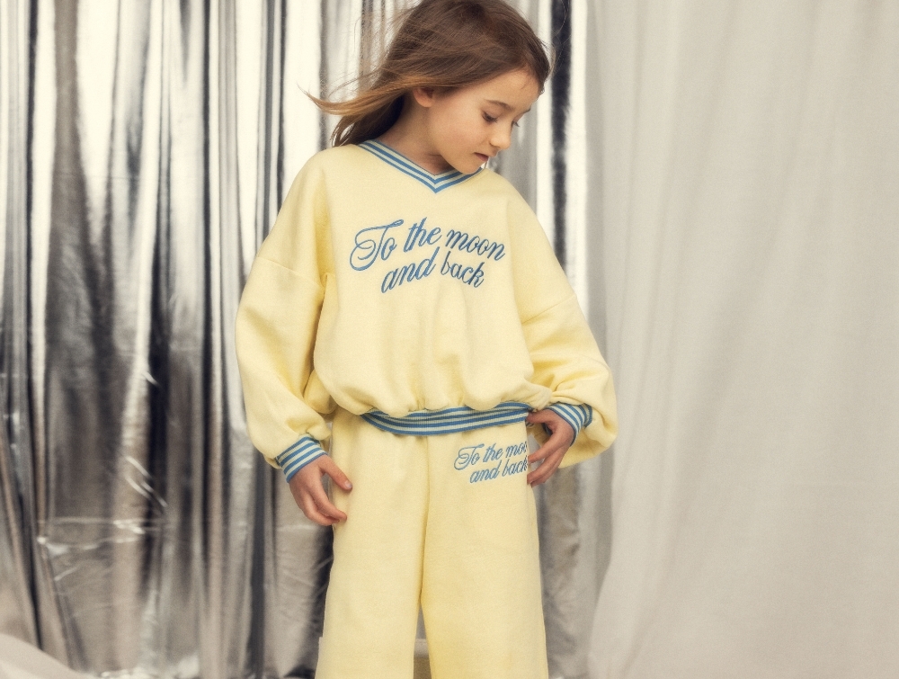 Mini Rodini sweatpants i yellow med to the moon broderi set forfraPige iklædt Mini Rodini sweatpants i yellow med to the moon broderi Mini Rodini sweatpants i yellow med broderet to the moon tekstMini Rodini sweatpants i yellow set bagfra