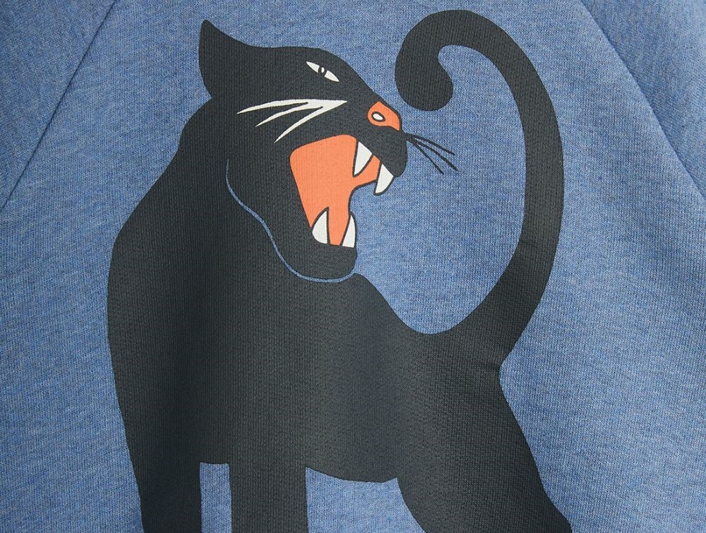 Blå meleret (blue melange) sweatshirt med print af en sort panter fra Mini Rodini.