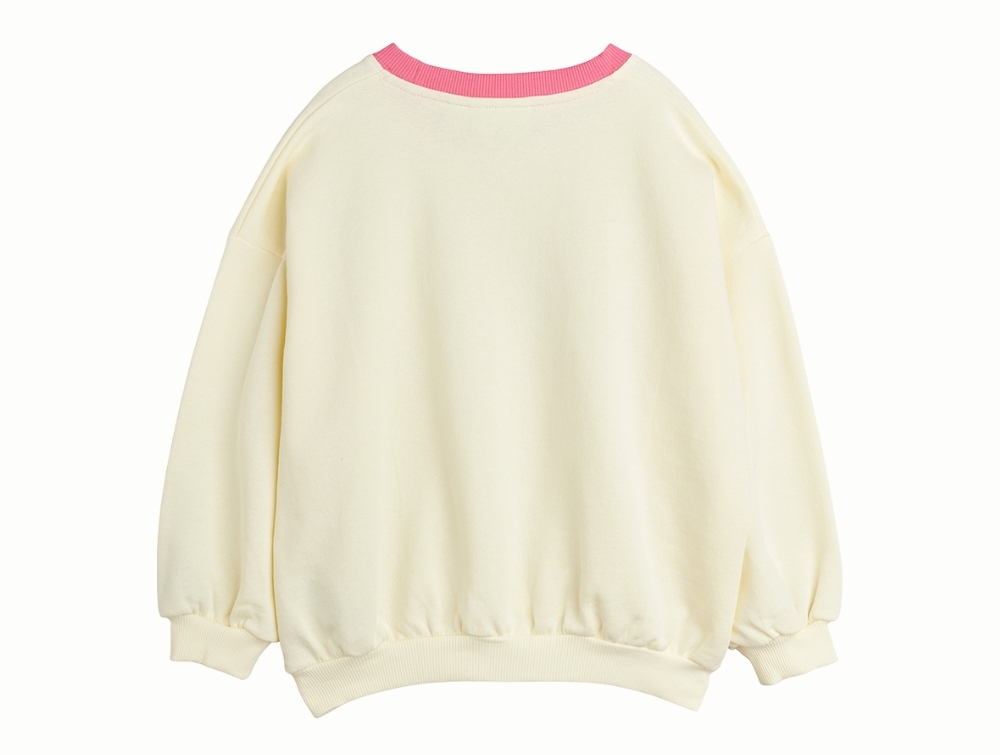 Sweatshirt i råhvid nuance fra Mini Rodini med “The Intergalactic Travel Agency” print på fronten og kontrastfarvet rib i halsen.