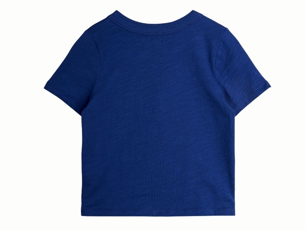 Kortærmet T-shirt i blå fra Mini Rodini med lille planetbroderi på brystlommen.