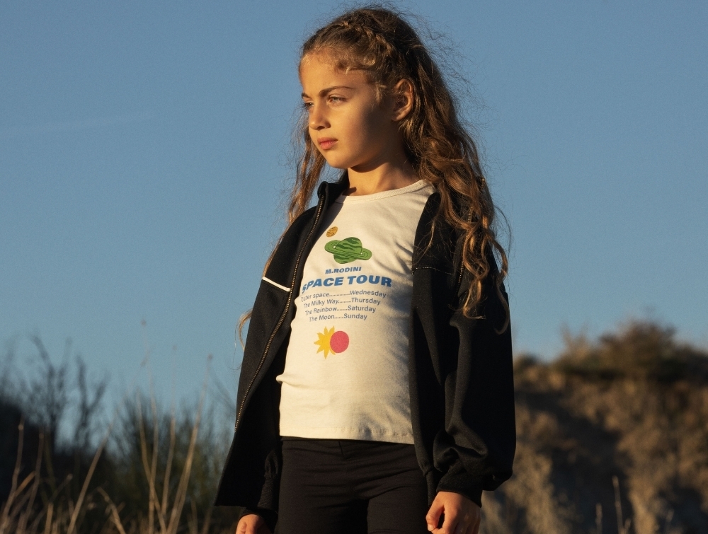 Mini Rodini t-shirt i off-white med space tour print set forfraPige iklædt Mini Rodini t-shirt i off-white med space tour print Mini Rodini t-shirt i off-white med space tour print detaljeMini Rodini t-shirt i off-white set bagfra