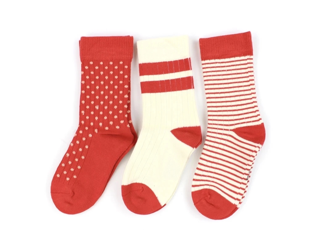 Pakken indeholder 3 par forskellige strømper i rød og råhvid.