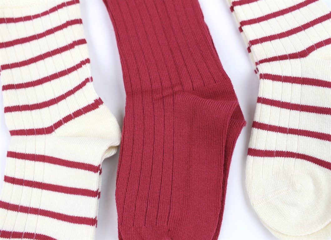 Pakken indeholder 2 par stribede strømper og ét par ensfarvede i farverne chili pepper og råhvid.