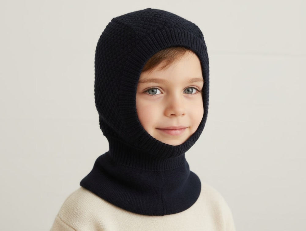 Designet har ribstrik omkring ansigt og hals, hvilket giver en fleksibel og tæt pasform, så huen bliver siddende, når barnet leger og bevæger sig. Merinoulden er naturligt temperaturregulerende og leder fugt væk fra huden, så barnet holdes varmt uden at blive fugtigt. Den tynde, strikkede struktur gør den oplagt under cykelhjelm eller flyverdragt.