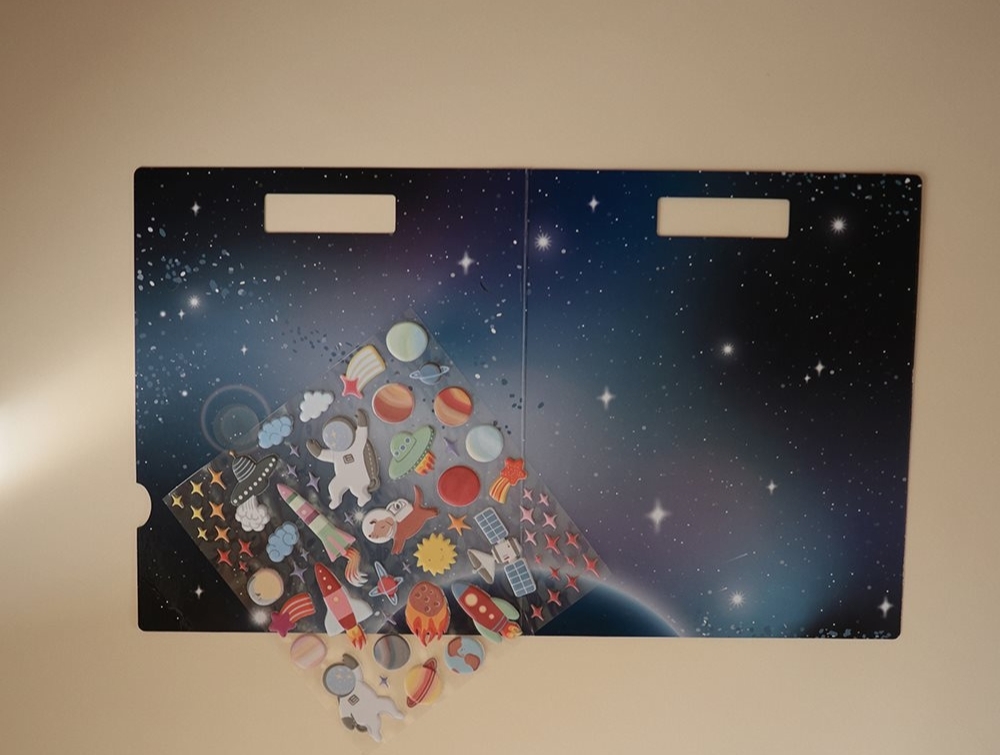 Indhold med rumfigurer fra Mushie klistermærkesæt spaceMushie space klistermærkesæt med info om funktionerOpslået baggrund med stjernehimmel fra Mushie klistermærkesætBarn leger med Mushie klistermærkesæt space