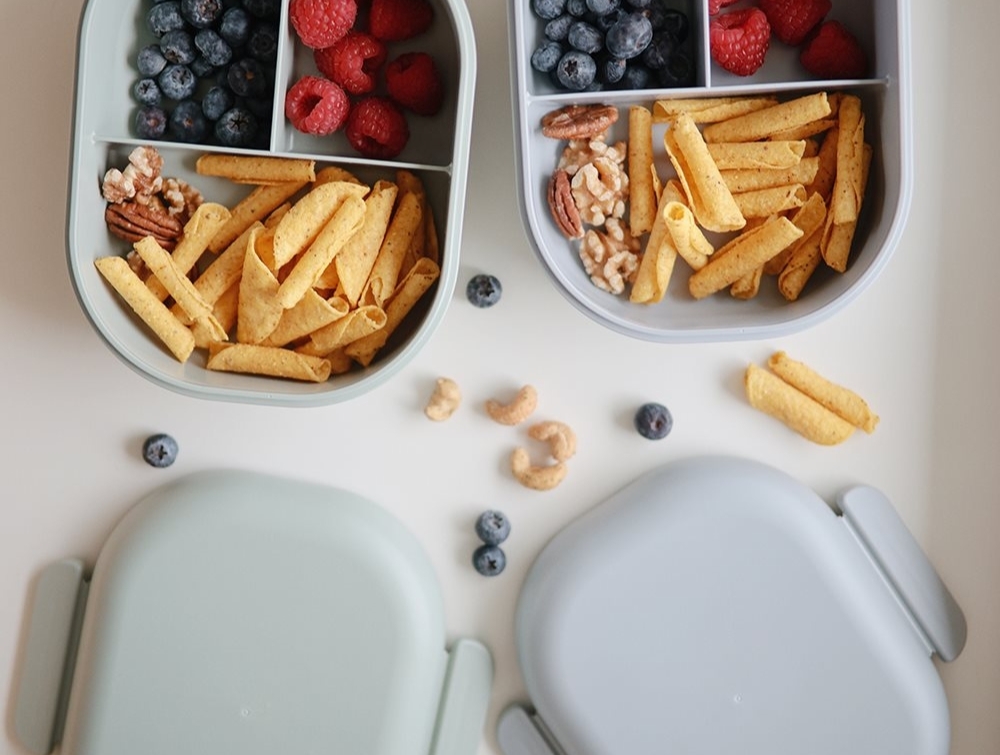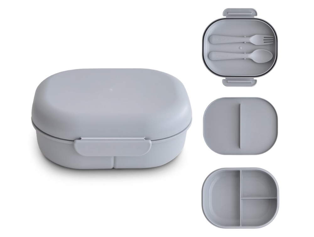 Madkasse i farven cloud fra Mushie med ruminddeling og integreret bestik. Perfekt til snacks og måltider på farten.